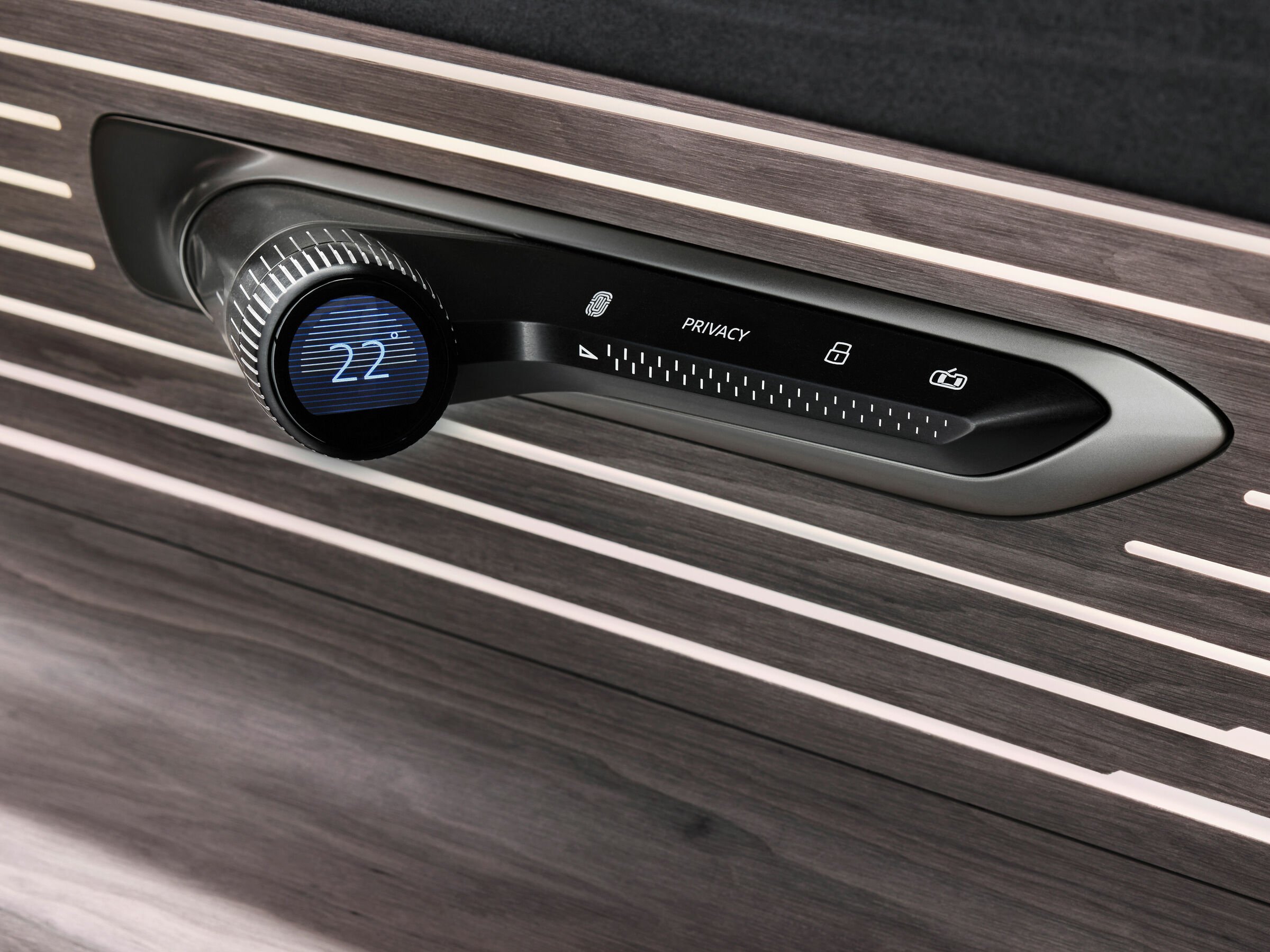 当乘客之间想要共享车载信息娱乐系统时,一块大尺寸的透明OLED屏便会从车顶垂直降至两排座椅之间。通过一块横穿整车内部的“影院大屏”,后排两名乘客可一起参加视频会议或观赏电影。该大屏还可分屏使用。在无需使用大屏时,由于其透明设计,乘客可直接清晰看到前方。乘客还可以选择将屏幕向上收起,与玻璃车顶融为一体。