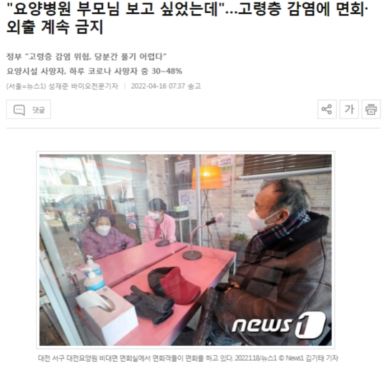 据《韩民族新闻》等多家媒体报道,疫情高峰期,“相互传染现象惨不忍睹,韩国医疗体系处于部分崩溃状态”。一些有基础疾病的老人甚至有“生死由命”的想法。在一些养老院,老人和护理员相互感染已成为“家常便饭”。在大田工作的护工李某(64岁)说:“自己要照顾17位到30位老人,原本从早上7时工作到下午4时,现在要工作到晚上10时,因为实在太累了,还担心自己确诊。”为让老人安度晚年,韩国政府已采取相应措施,如鼓励60岁以上人群接种第四针新冠疫苗。对养老院来说,要求其增加医护人员、限制探视时间,如出现群体确诊,政府派医疗团队直接进入参与治疗。
