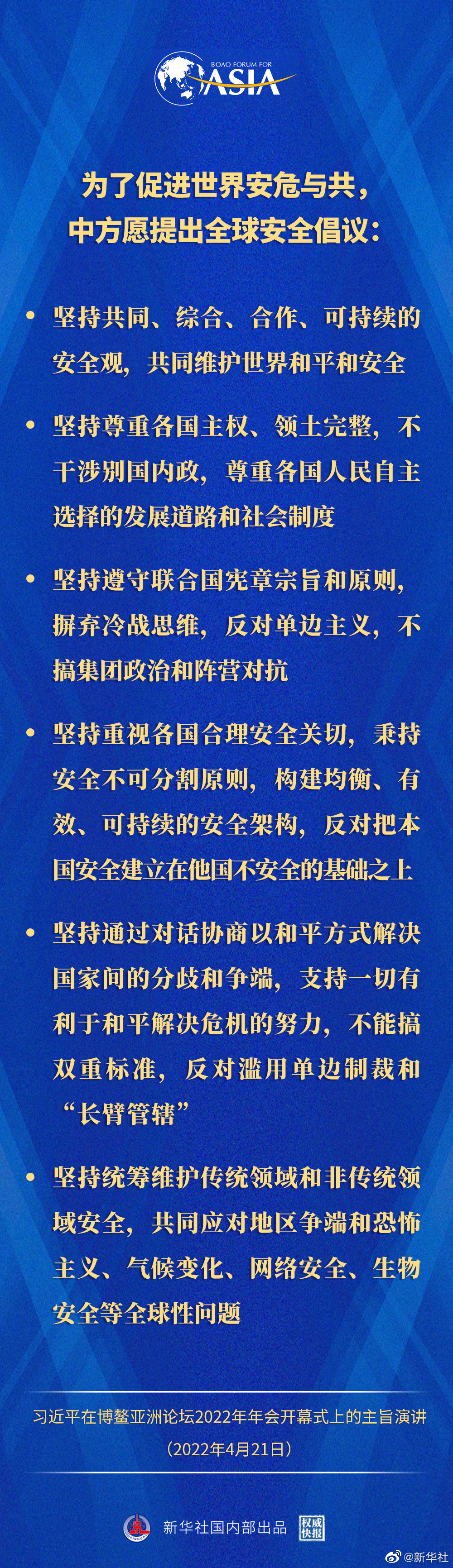 习近平指出,为了促进世界安危与共,中方愿提出全球安全倡议:要坚持共同、综合、合作、可持续的安全观,共同维护世界和平和安全;坚持尊重各国主权、领土完整,不干涉别国内政,尊重各国人民自主选择的发展道路和社会制度;坚持遵守联合国宪章宗旨和原则,摒弃冷战思维,反对单边主义,不搞集团政治和阵营对抗;坚持重视各国合理安全关切,秉持安全不可分割原则,构建均衡、有效、可持续的安全架构,反对把本国安全建立在他国不安全的基础之上;坚持通过对话协商以和平方式解决国家间的分歧和争端,支持一切有利于和平解决危机的努力,不能搞双重标准,反对滥用单边制裁和“长臂管辖”;坚持统筹维护传统领域和非传统领域安全,共同应对地区争端和恐怖主义、气候变化、网络安全、生物安全等全球性问题。