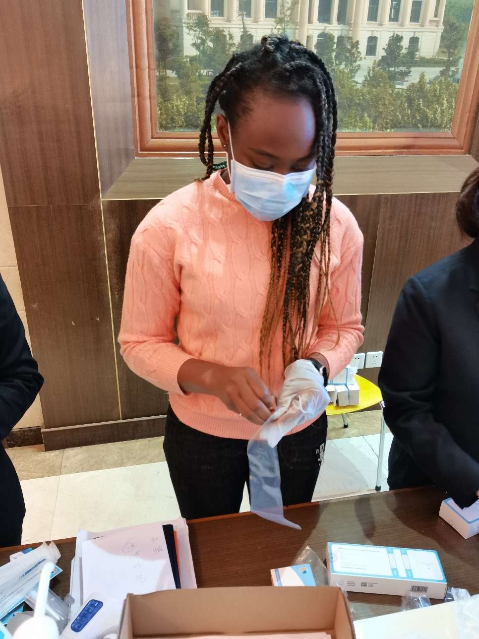 “通过为同学们送餐、核酸签到、抗原试剂的发放、检测结果的收集等各种任务,我把我的爱、时间和力量都奉献给了同学们。” 来自尼日利亚的留学生OGECHUKWU MARY ELUI(中文名:秦歌)说, “能够服务和回报社会,真是我的荣幸。希望疫情快点儿结束,希望一切恢复正常。”