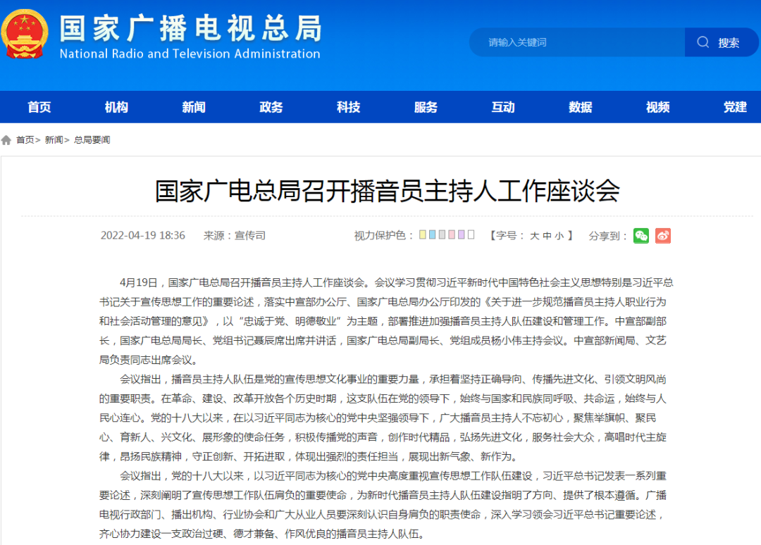 4月19日,国家广电总局召开播音员主持人工作座谈会。