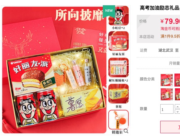 为普通商品赋予“高考”属性,有助于销量增长的同时,消费者可能还会因为想要讨个好彩头,不太计较其实际价值。记者看到,今年不少商家极具创意地推出“高考励志礼包”,将旺仔牛奶、薯愿薯片,芬达汽水等各类现成小零食放在一个盒子里重新包装出售。以一份励志礼包为例,内含两听旺仔牛奶,一盒2枚装的好丽友派,一小盒薯愿薯片,以及几枚祝福便签。组成精美礼包后售价79.9元,而如果分别购买,这些东西总价不会超过20元。