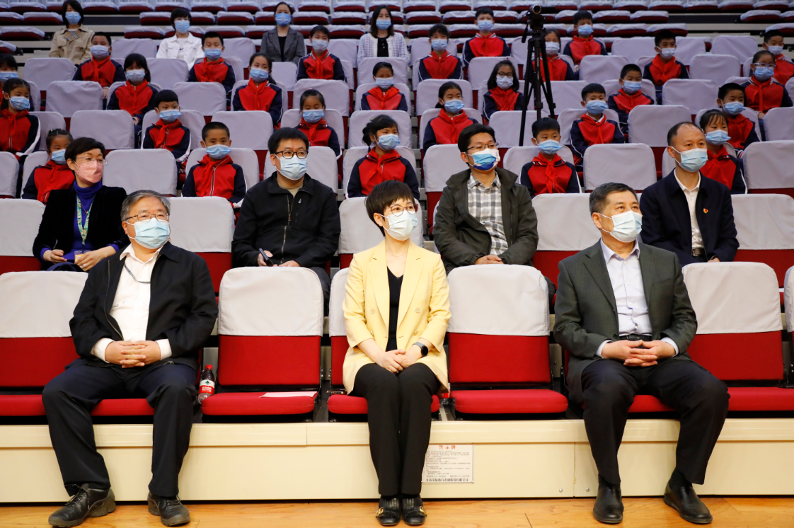 现场领导、嘉宾和孩子们:前排自左至右:故宫出版社社长章宏伟;密云区政府副区长马春秀;故宫博物院副院长闫宏斌