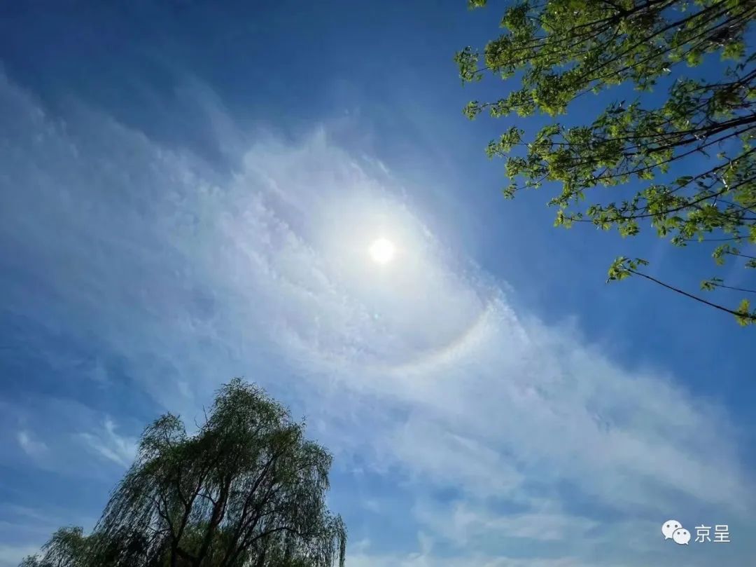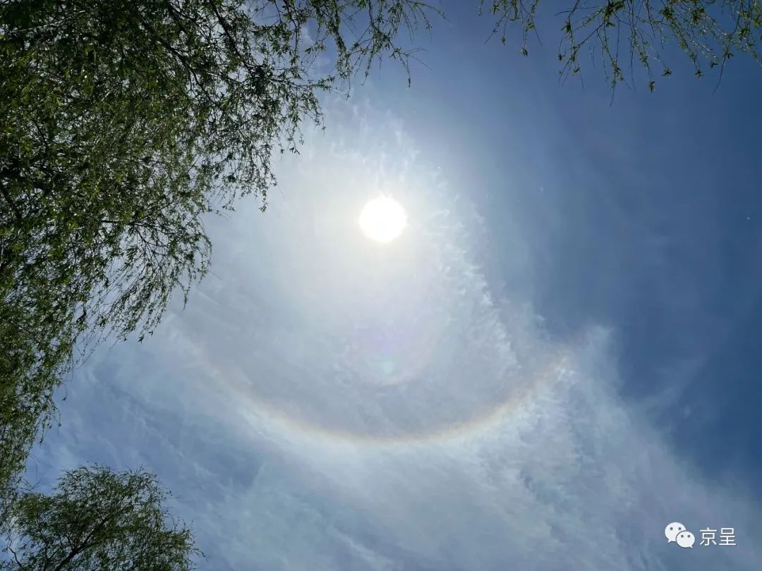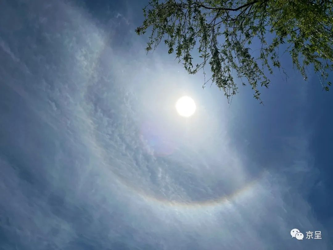 北京城市副中心大运河畔,摄影师马文晓无意中抬头,看到了天上奇特的天文现象,太阳被一圈光晕罩住,像是背了一口透明的大锅。