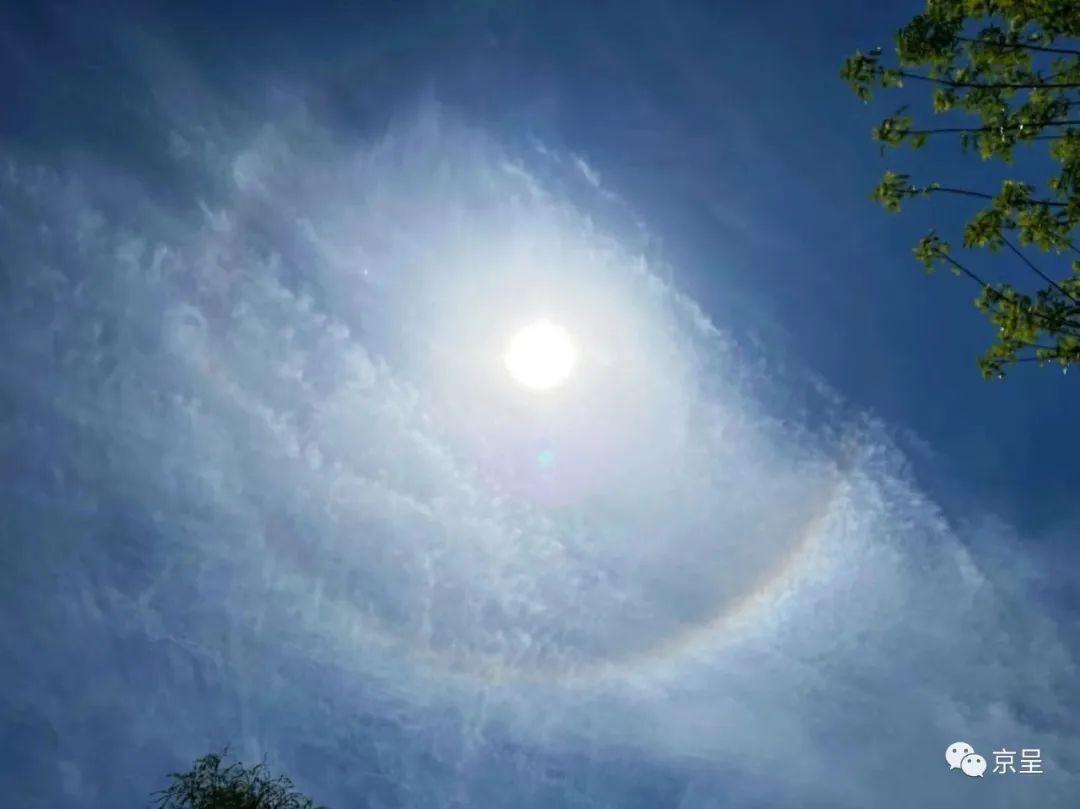 这种像是太阳“背锅”的现象,其实叫做日晕,又叫圆虹 ,是一种大气光学现象,是日光通过卷层云时,受到冰晶的折射或反射而形成的。当光线射入卷层云中的冰晶后,经过两次折射,分散成不同方向的各色光。