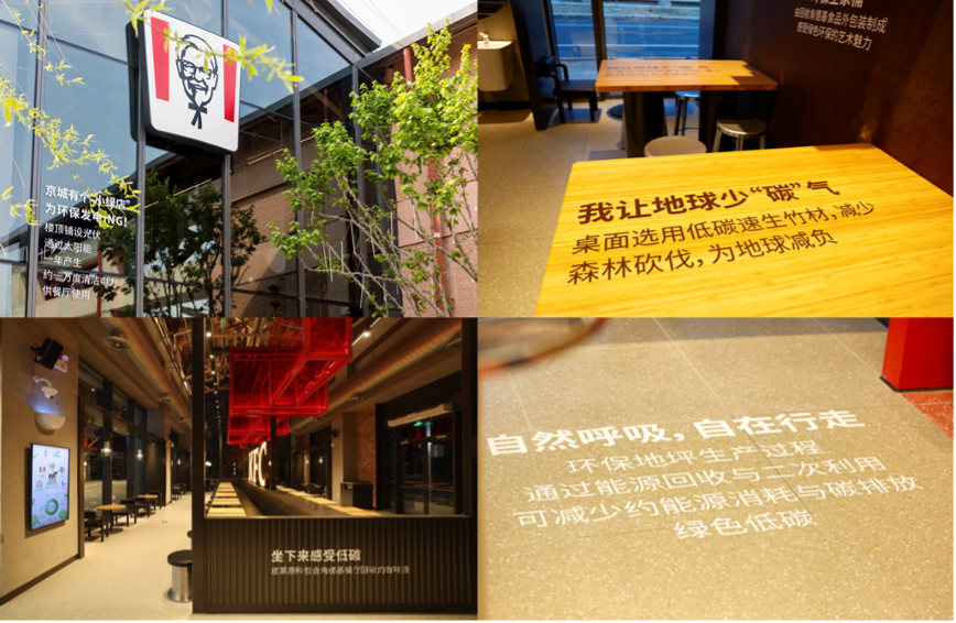餐厅首先科学整合了肯德基多年来在全国超8100家餐厅所推行的节能减排和减塑环保等各项举措,并基于实践经验引入先进的低碳环保技术。基于物联网、大数据和人工智能等技术的IOT餐厅智能系统则实现了餐厅的智能化能效管理,有效降低能源消耗约10%。二次回收能源地坪、咖啡渣再生皮革、低碳竹材和太阳能遮阳伞等新型环保材质、设备在“小绿店”的巧妙使用,也在细节中以材料回用、循环、替代的方式实现餐厅建造和运营过程中的节能减排。