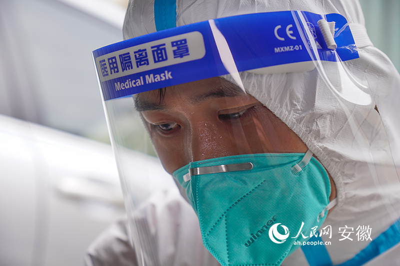 在隔离面罩下,郑隆已是汗如雨下。人民网 陈若天摄