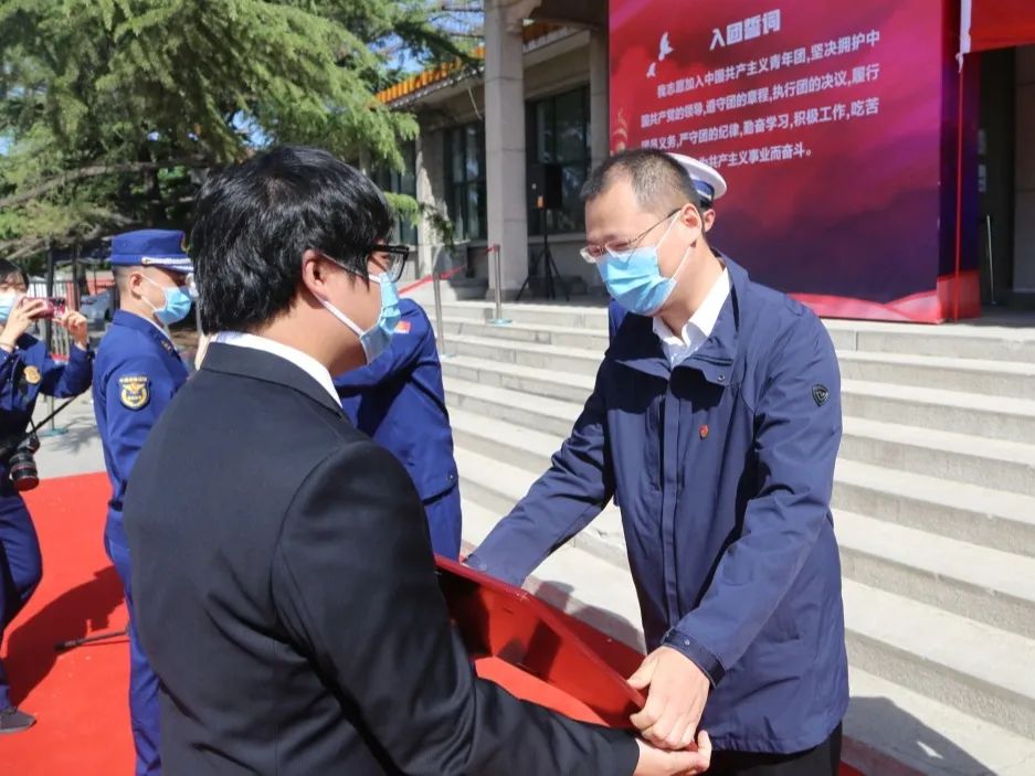 在动听嘹亮的团歌声中,新加入流动团支部的团员代表步履坚定、整齐列队,与会领导为他们一一佩戴团徽。新任流动团总支书记孙卓带领大家重温入团誓词,“遵守团的章程,执行团的决议……”在一声声铿锵有力的宣誓中,所有人穿越时空、回望初心、再续使命,更加坚定了广大团员青年将青春奉献给消防救援事业的坚定信念。