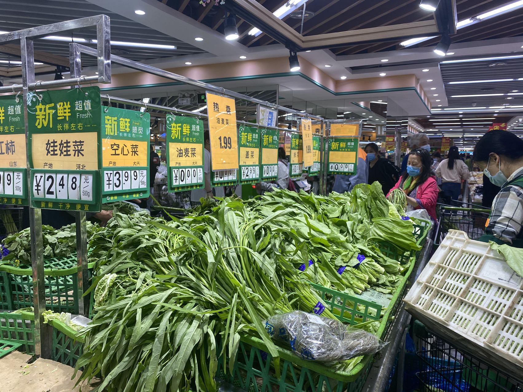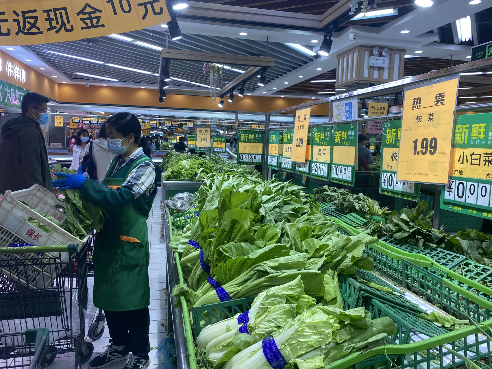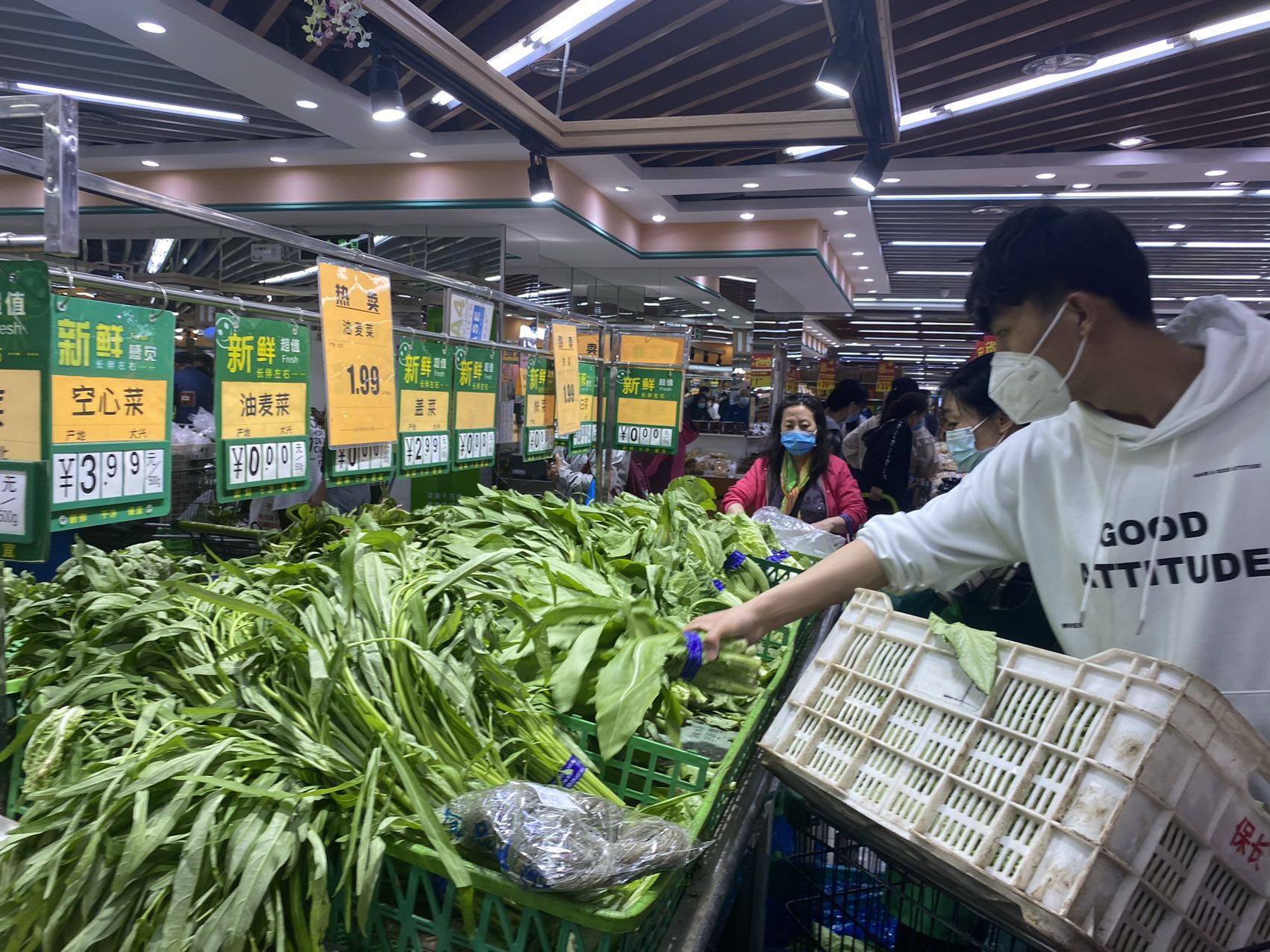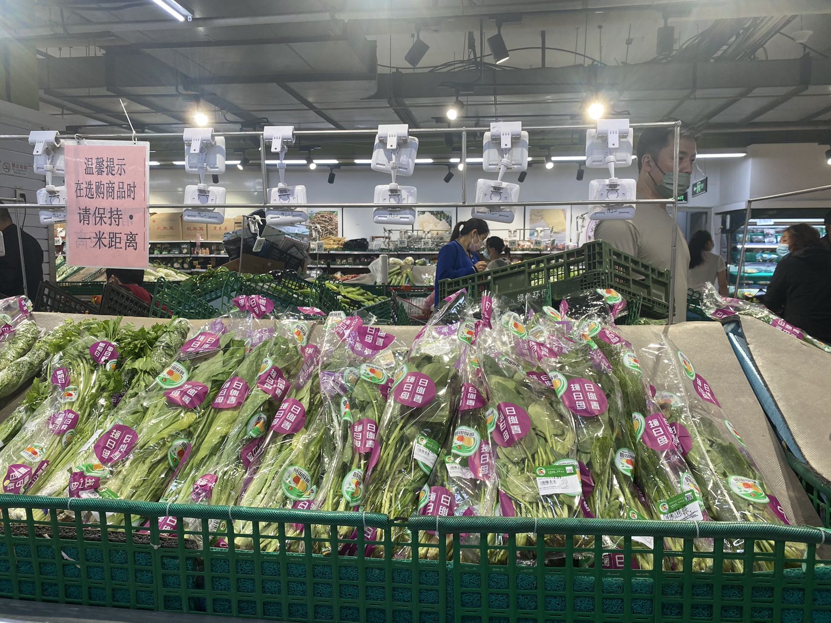 晚上8点多,记者在宋家庄首开福茂的幸福荣耀超市里看到,售货员还在上架油麦菜,将其用胶带捆成一捆放在货架上供挑选。从整个生鲜区情况看,各类蔬菜种类齐全。