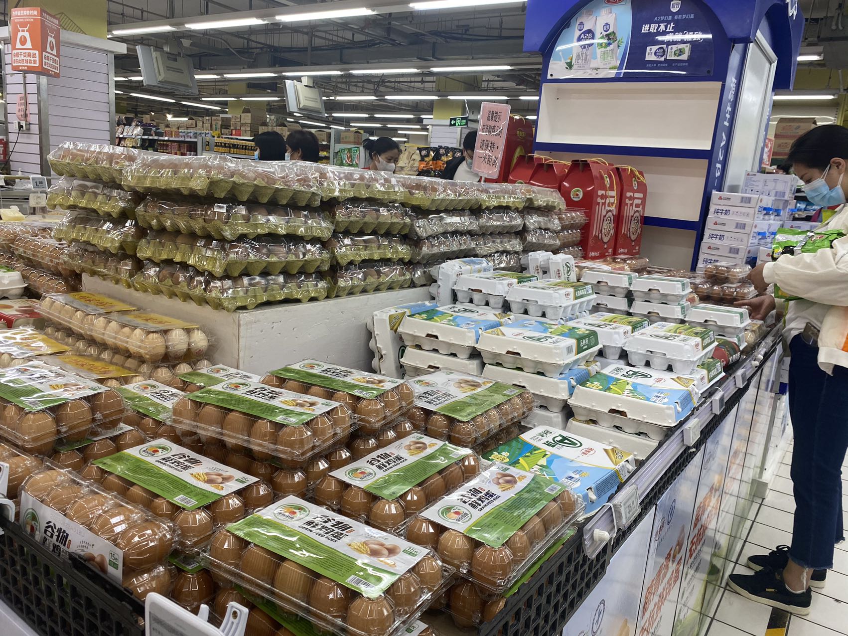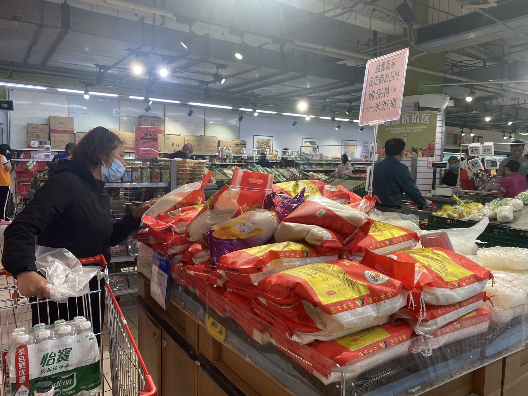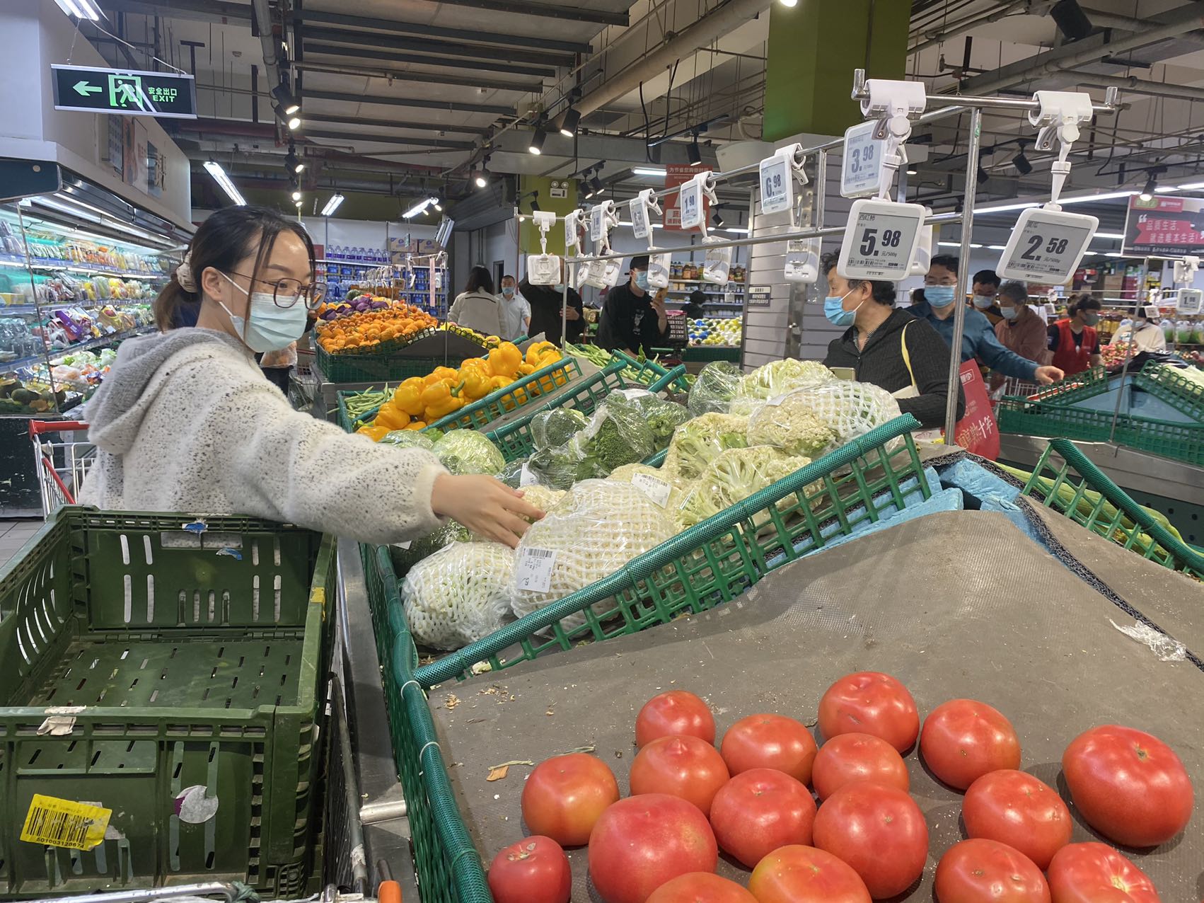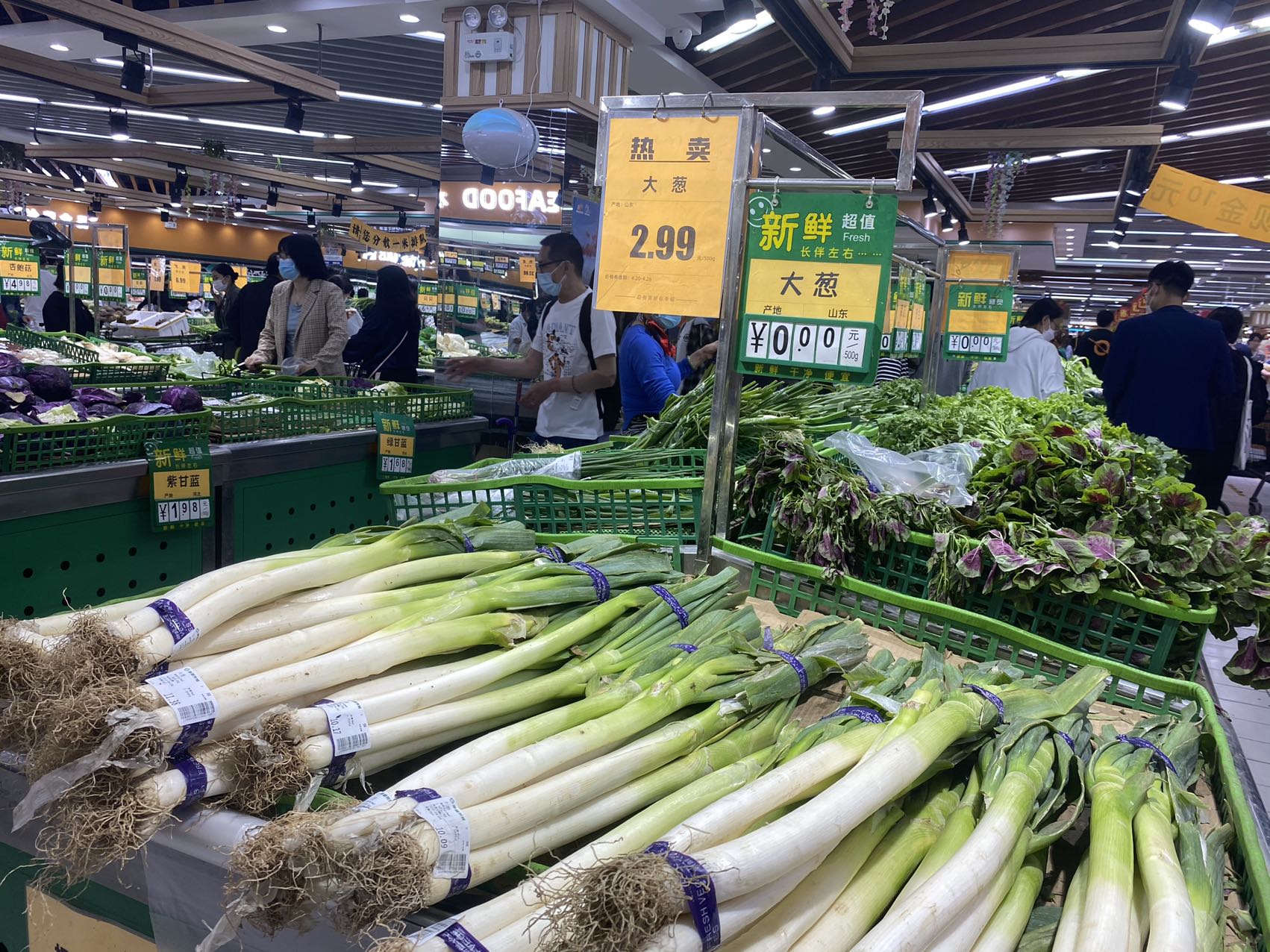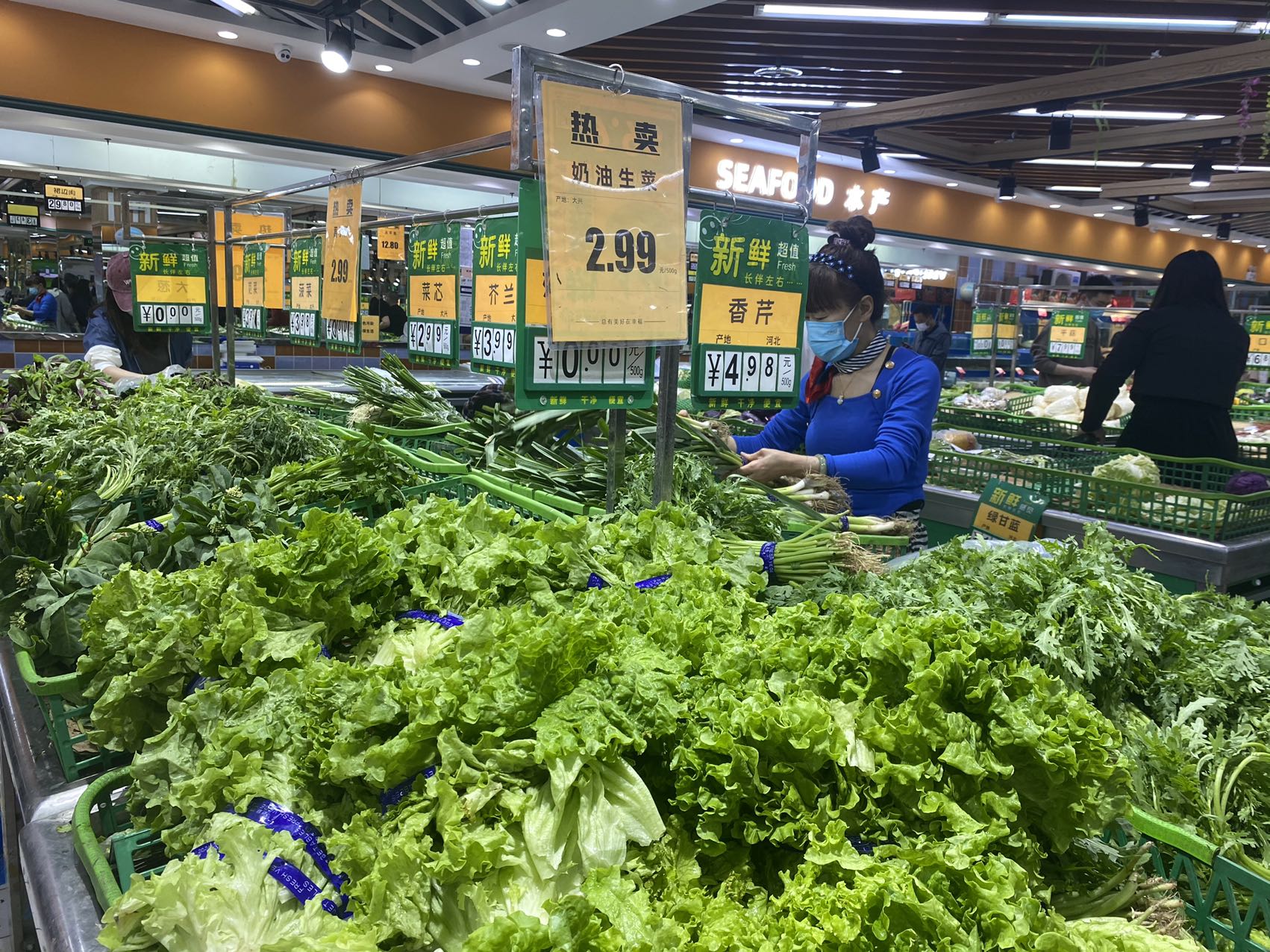 晚上8点多,记者在宋家庄首开福茂的幸福荣耀超市里看到,售货员还在上架油麦菜,将其用胶带捆成一捆放在货架上供挑选。从整个生鲜区情况看,各类蔬菜种类齐全。