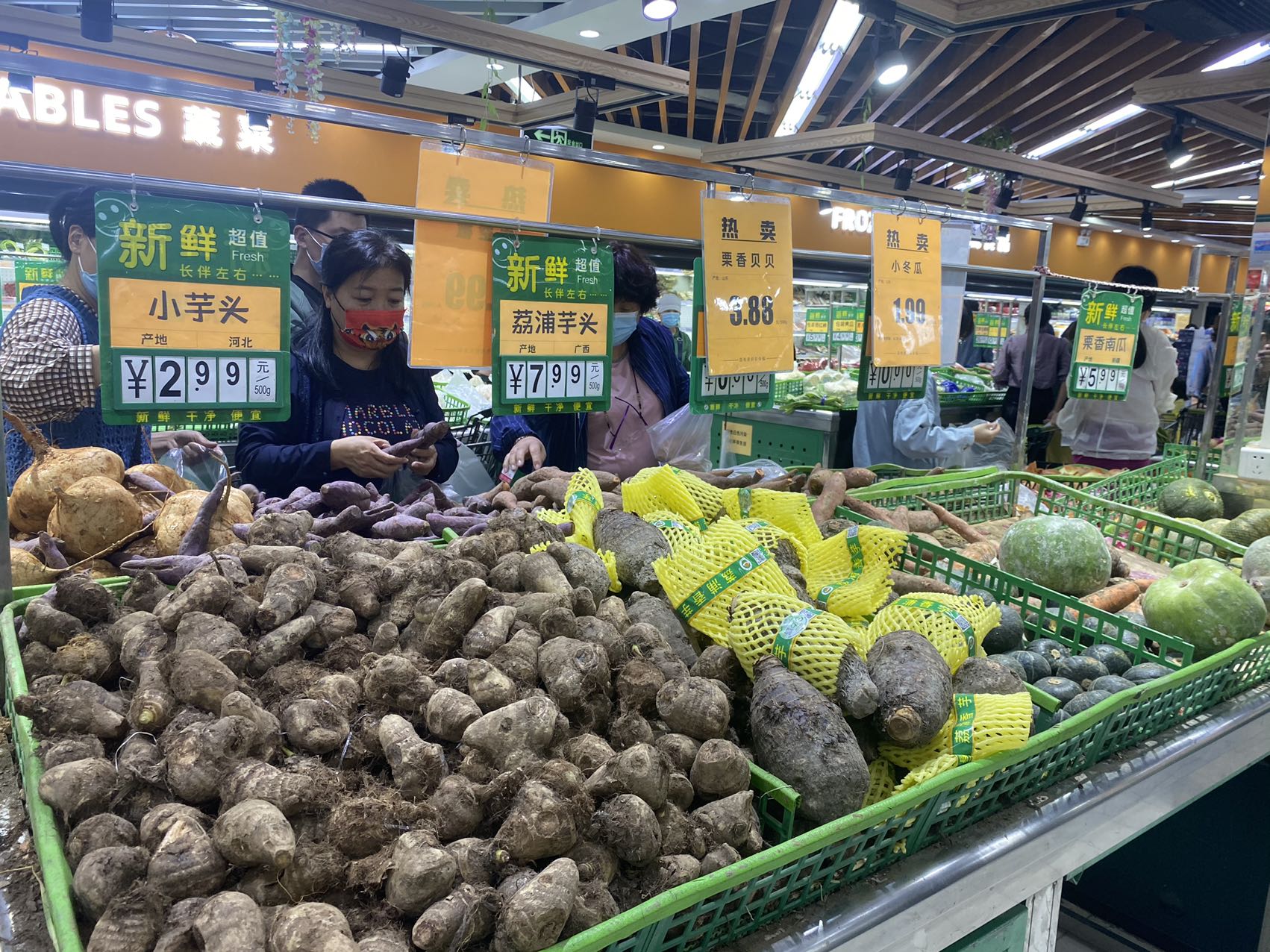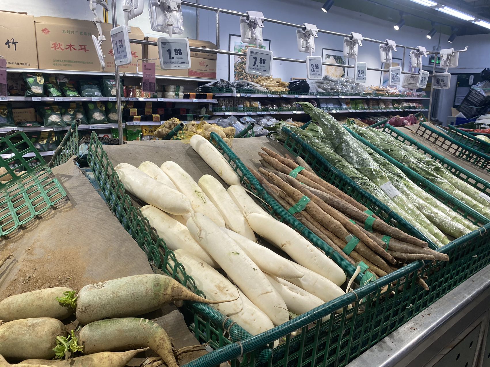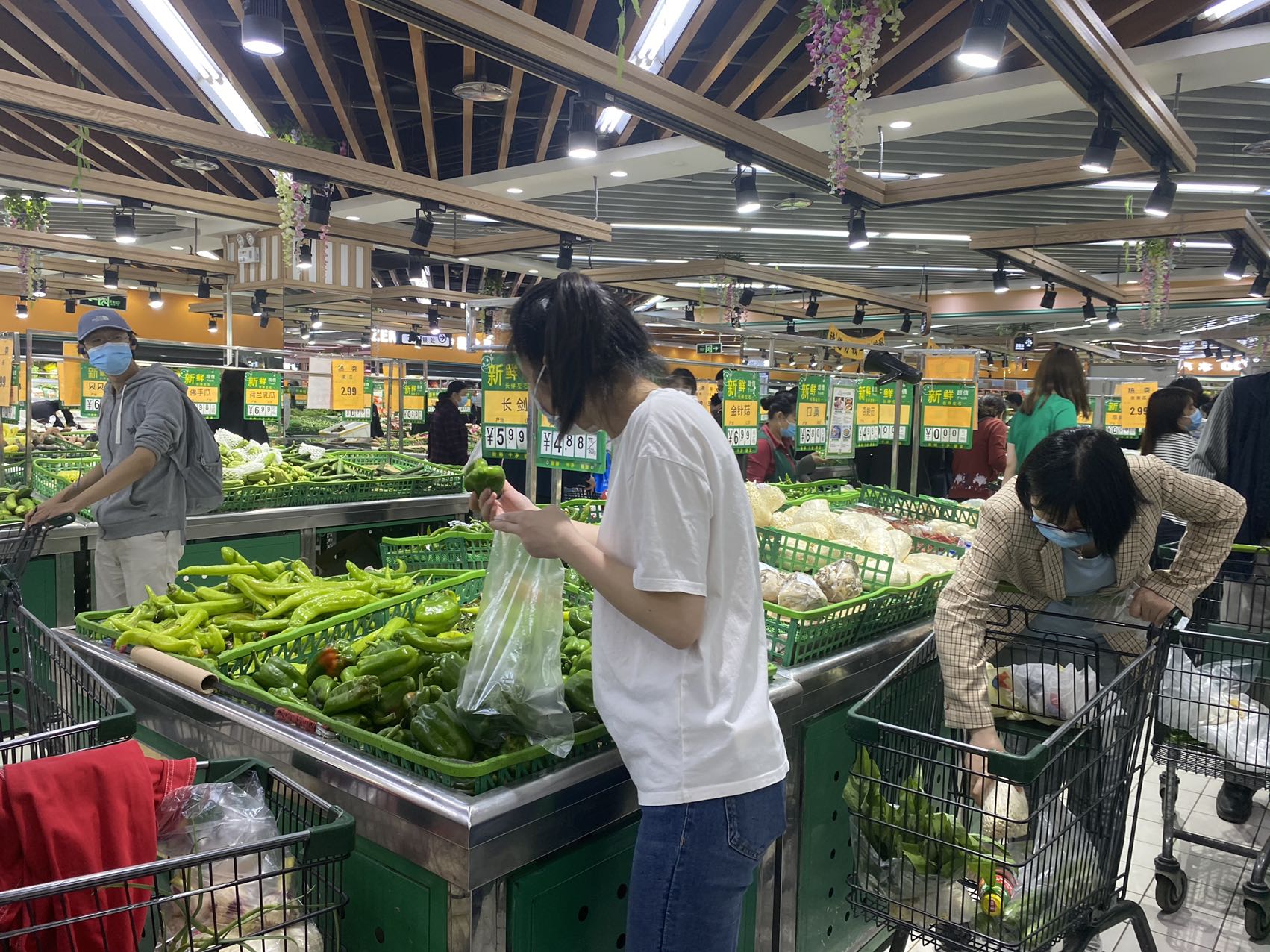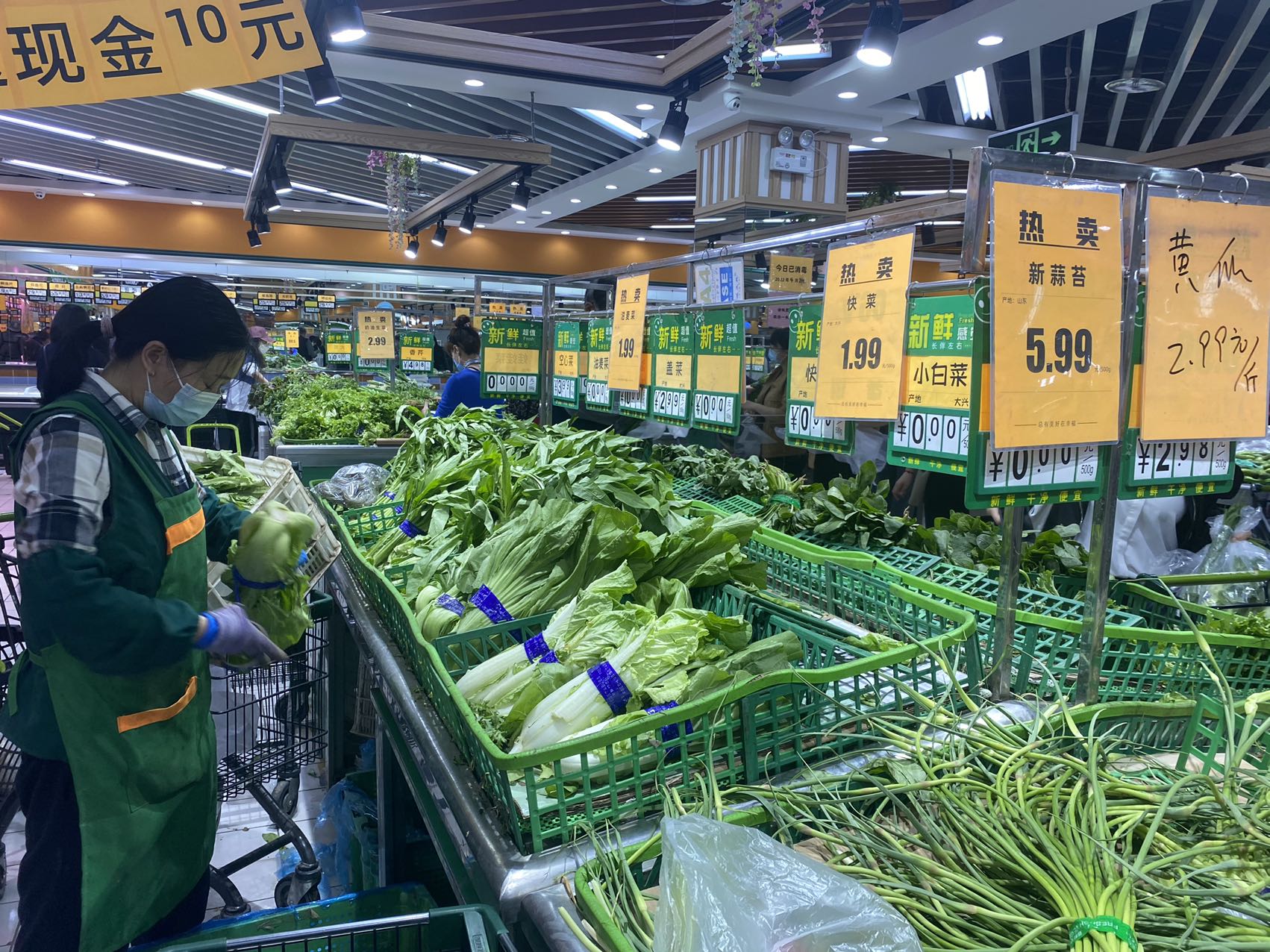 在宋庄路的物美生活超市里,售货员将剩下的绿叶菜按两捆打包,便宜出售。超市里西红柿、白萝卜、红薯还剩下不少。