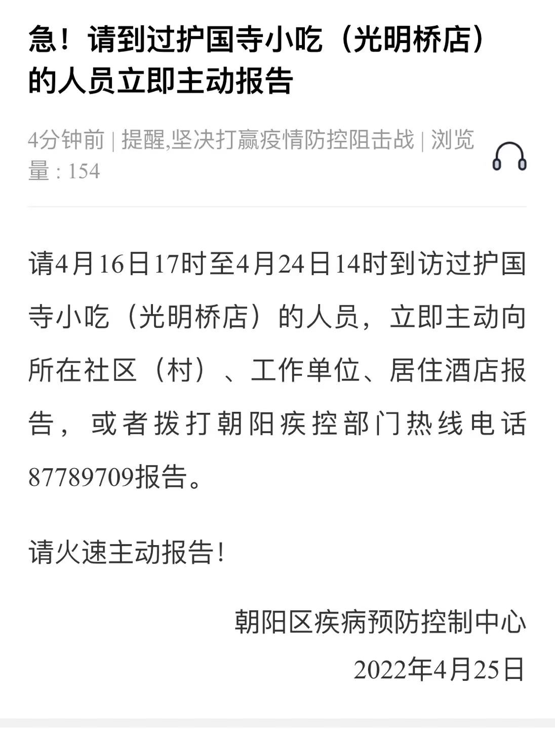 请4月16日17时至4月24日14时到访过护国寺小吃(光明桥店)的人员,立即主动向所在社区(村)、工作单位、居住酒店报告,或者拨打朝阳疾控部门热线电话87789709报告。