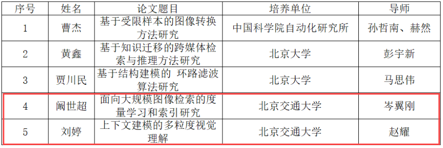 近日,北京图象图形学学会公布了BSIG2022优秀博士学位论文及优秀导师评选结果。计算机与信息技术学院阚世超、刘婷两位博士的学位论文《面向大规模图像检索的度量学习和索引研究》、《上下文建模的多粒度视觉理解》双双入选。岑翼刚教授、赵耀教授获得2022年北京图象图形学学会优秀导师奖。