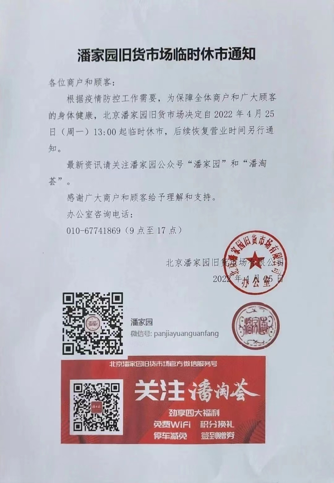 通知称,根据疫情防控工作需要,为保障全体商户和广大顾客的身体健康,北京潘家园旧货市场决定自4月25日13:00起临时休市。每周五晚上的潘家园文化夜市自4月29日起临时休市,后续开放时间另行通知。后续最新资讯可关注潘家园公众号“潘家园”和“潘淘荟”了解。