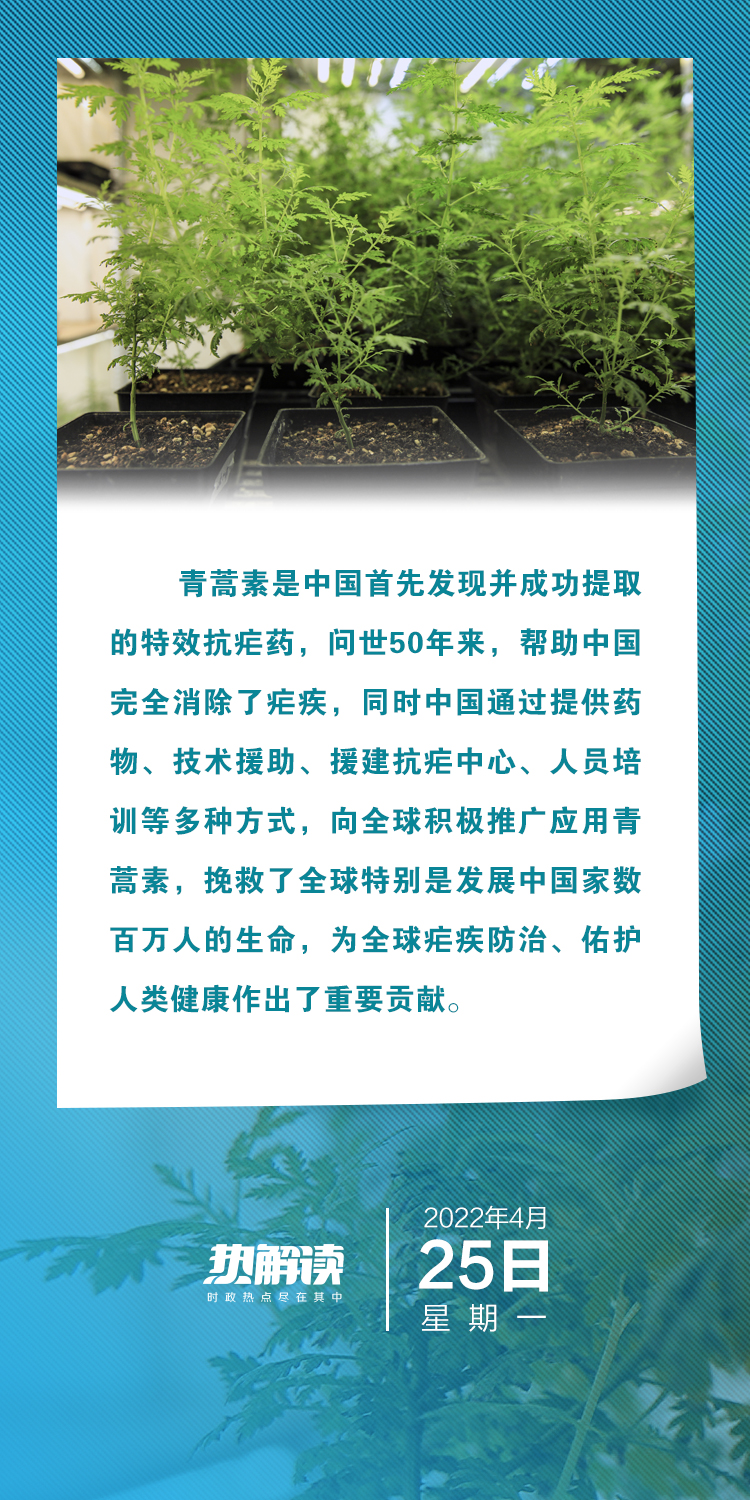 4月25日是“世界防治疟疾日”。习近平主席向青蒿素问世50周年暨助力共建人类卫生健康共同体国际论坛致贺信。