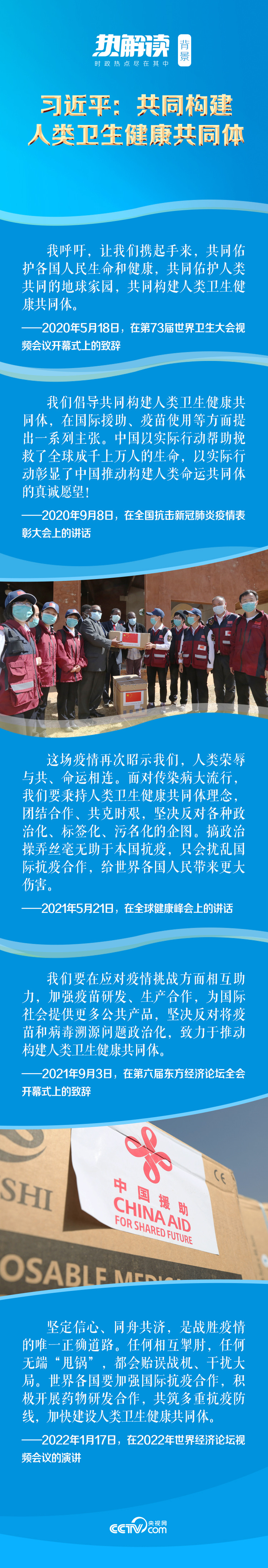 2020年3月,在致法国总统马克龙的慰问电中,习近平主席首次提出了“人类卫生健康共同体”理念。此后,习主席多次在国际国内重大场合重申这一理念。