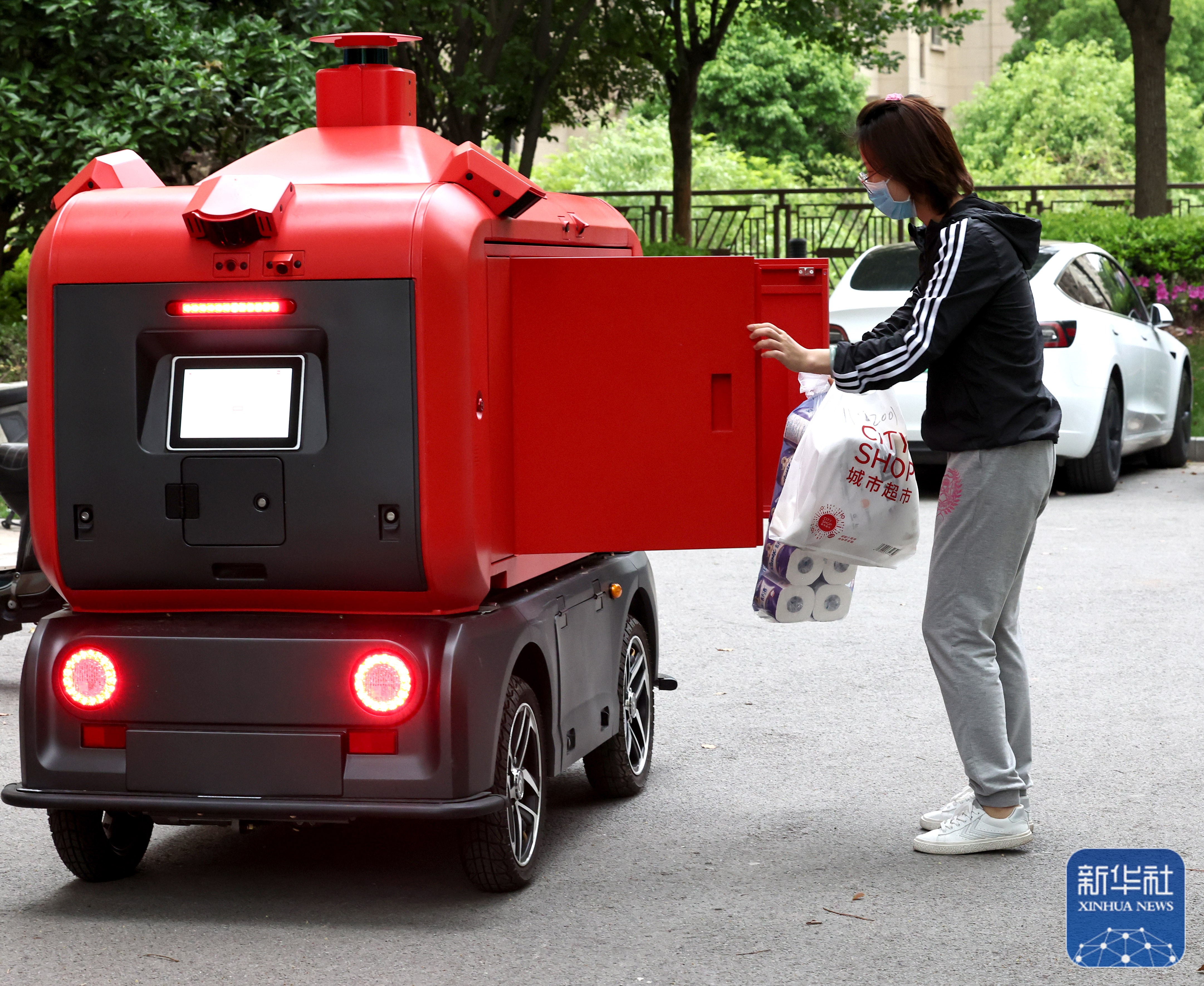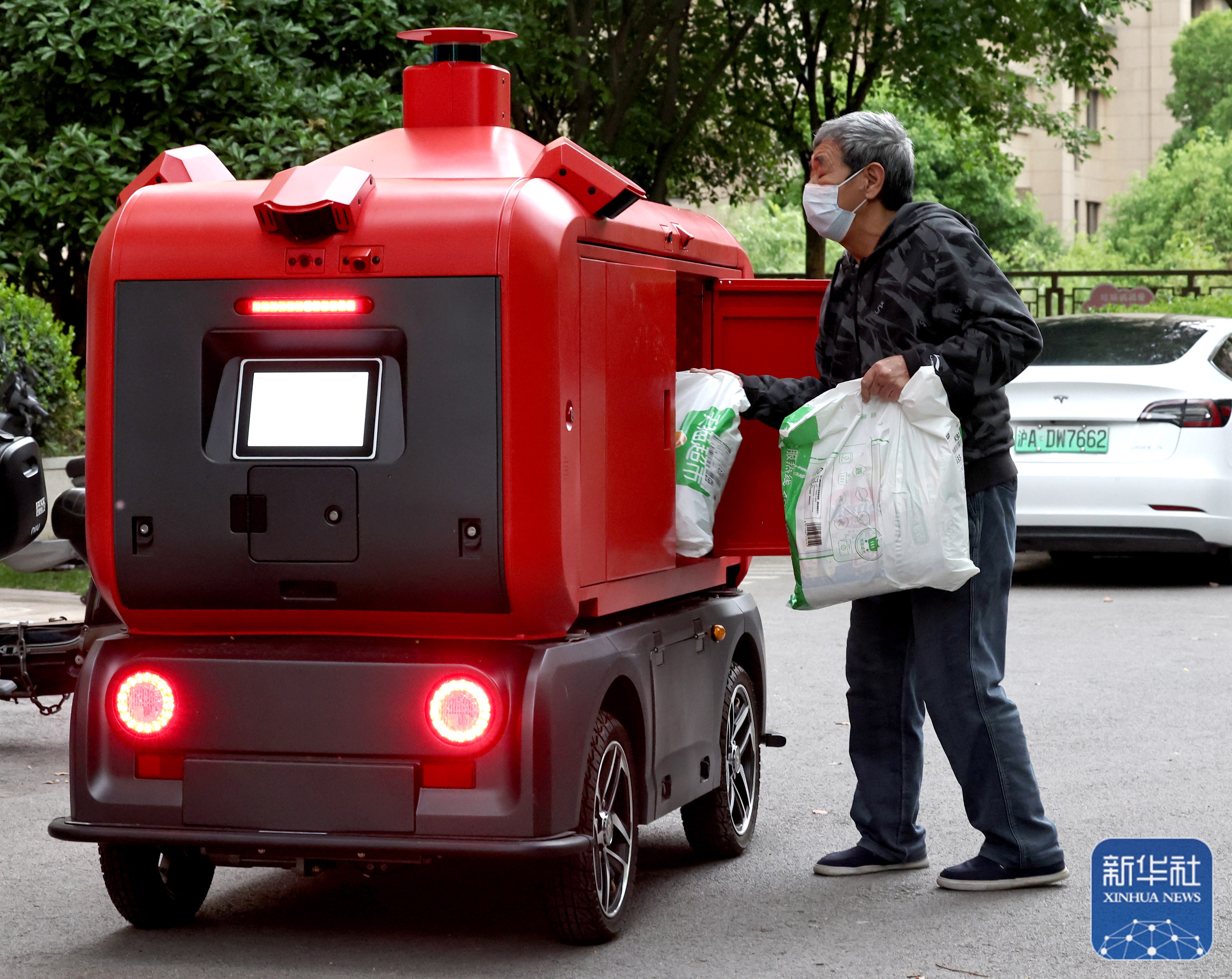 4月25日,上海市嘉定区南翔镇一小区的居民从智能快递车上取货。