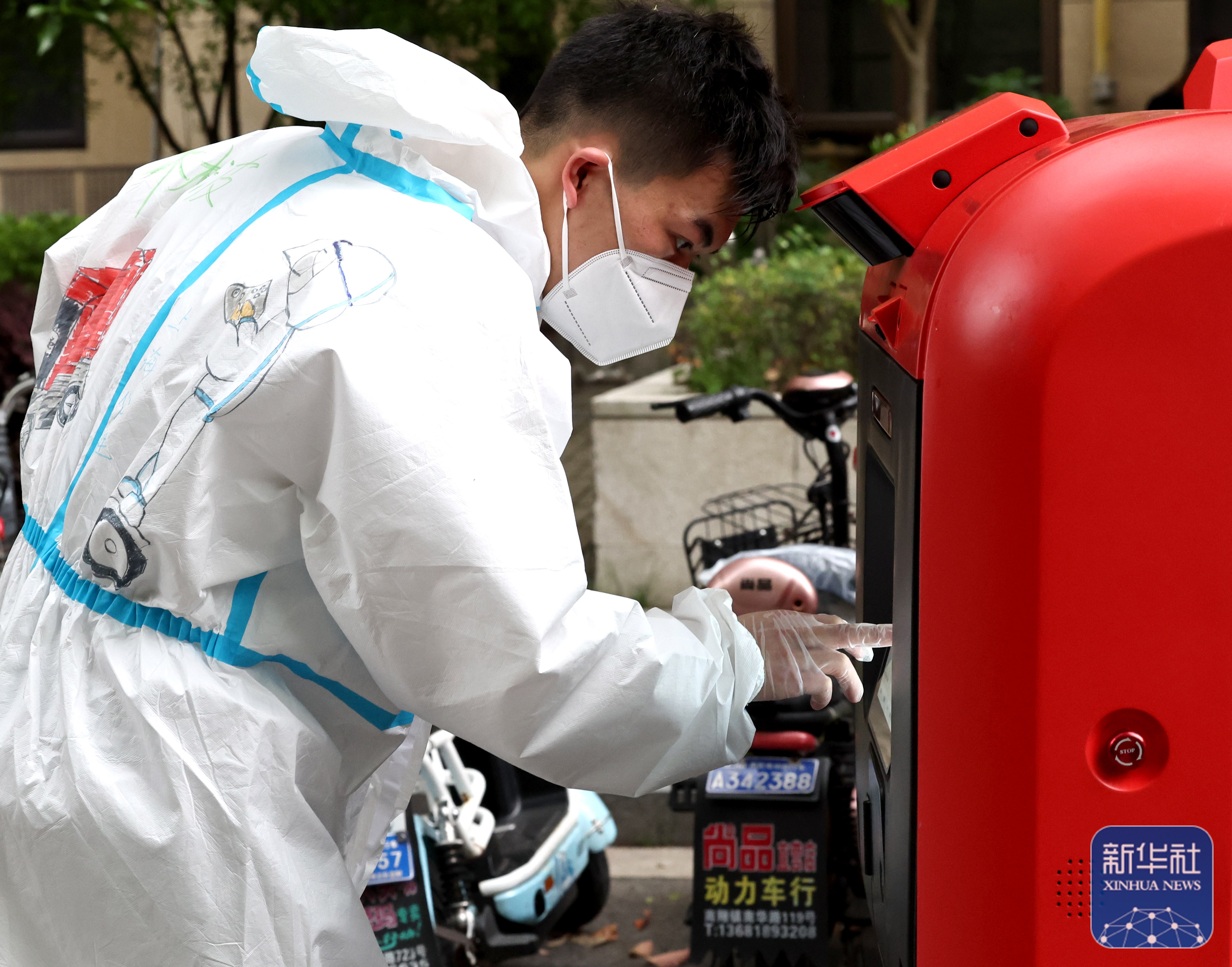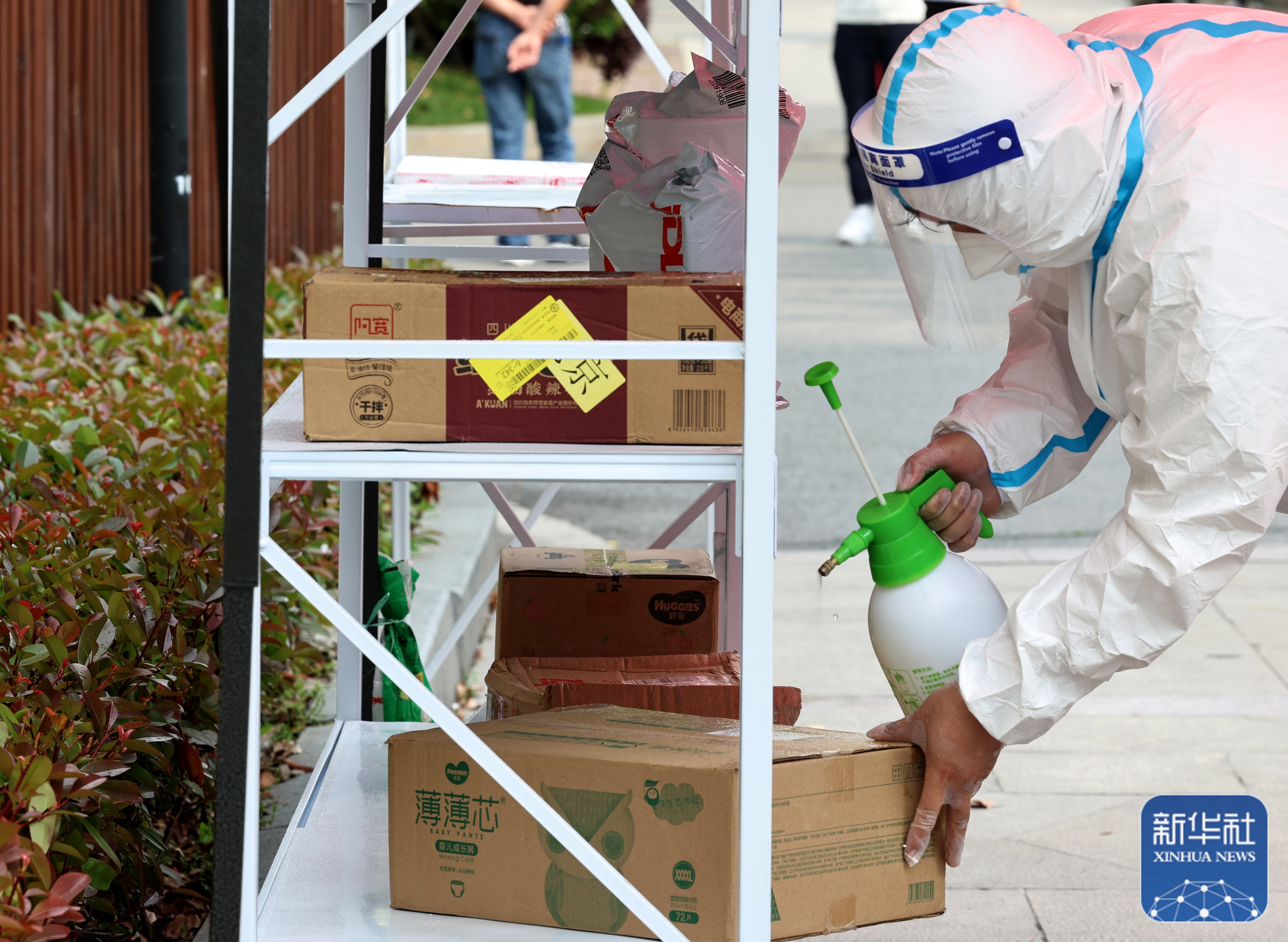 4月25日,在上海市嘉定区南翔镇一小区内,工作人员对“无接触社区保供站”货架上的货物进行二次消杀。