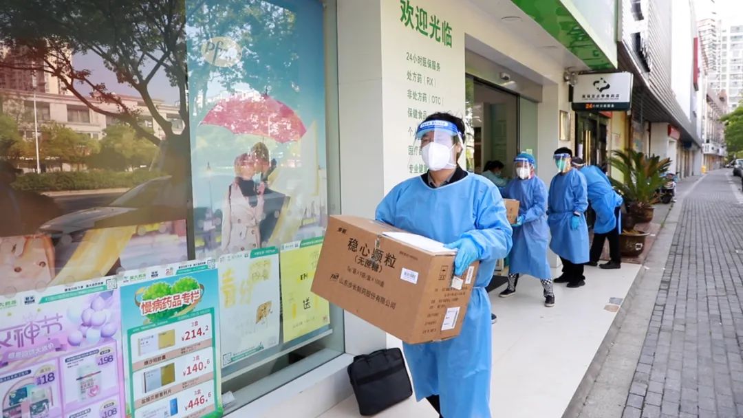 在三林镇,配送药志愿者们来到辖区内的国大药房,为居民配药。半个月来,他们为社区居民们送去了许多常用药,同时,他们也为网上下单买药的居民送药。