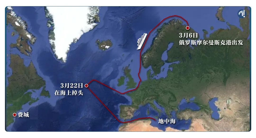 3月6日,它满载着100万桶石油从俄罗斯的摩尔曼斯克港出发,前往美国费城。