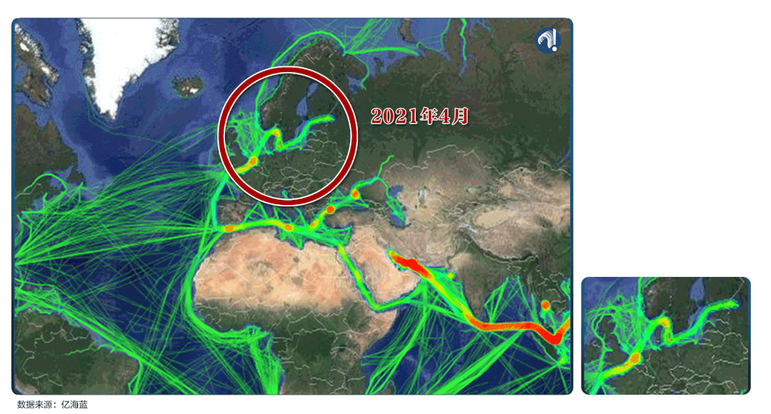 位于波罗的海的圣彼得堡港,是俄罗斯主要挂靠集装箱的港口之一,涵盖了俄罗斯向欧洲的有色金属出口。这是去年4月与今年4月波罗的海地区集装箱的航线热力图: