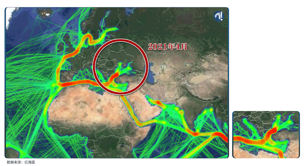 可以看到,黑海地区的运力在显著下降,其中俄罗斯从亚速海连接到黑海的航线,几乎断航了。