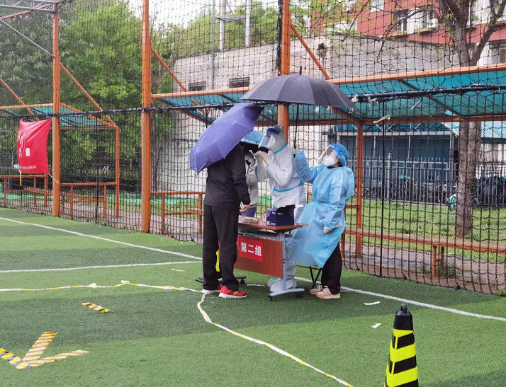 撑伞护航的动人场景不止一个。清晨六点半,突然下起了雨,咏园核酸检测点立即开始搭建帐篷,但是核酸采样不能停。现场引导秩序的“小蓝”立马拿起了伞,奔向“大白”,偏伞为“大白”撑起一方晴天,无延时为居民进行采样。