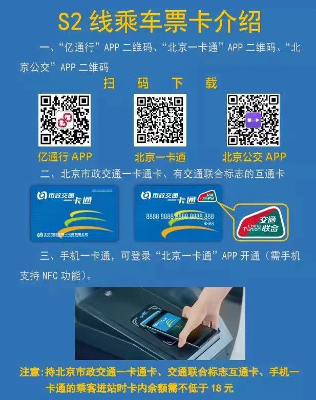 S2线单列限员900人次,目前可使用的票卡主要有北京市政交通一卡通、有交通联合标志的互通卡、“亿通行”APP二维码、“北京一卡通”APP二维码、“北京公交”APP二维码及手机一卡通。