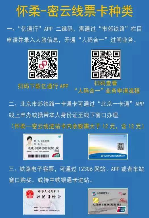 怀柔-密云线单列限员643人次,目前可使用的票卡主要有铁路电子客票(300人次/列)、“亿通行”APP二维码和市郊铁路一卡通卡(343人次/列)。铁路电子客票可通过12306网站、APP预定或者在车站售票窗口购买,持本人身份证乘车。持“亿通行”APP二维码的乘客需提前录入人脸信息,开通“人码合一”过闸业务。