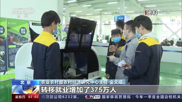 农业农村部农村经济研究中心主任 金文成:国家加大了农民劳动力的转移就业的支持力度。今年一季度农民劳动力外出务工转移就业增加了375万人,已经恢复到2019年的水平。这样农民就业增加了,相对收入也增加,同时农民外出务工的工资水平也比以往有了明显的增加。