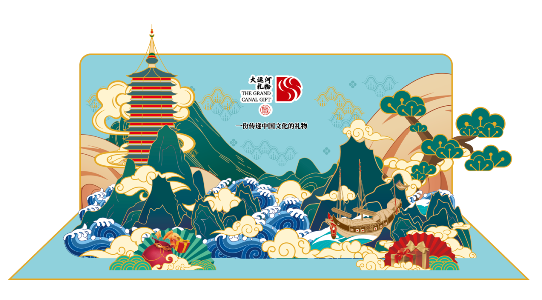 大运河主题立体展陈以运河风貌为主要元素,选取两岸塔影青山、运河船舶及象征运河物产的礼物盒子为一体,传递中国文化自信。