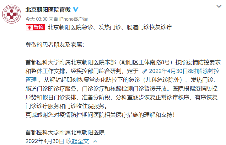 首都医科大学附属北京朝阳医院本部(朝阳区工体南路8号)按照疫情防控要求和整体工作安排,经疾控部门综合研判,定于2022年4月30日8时解除封控管理 。从解封起即刻恢复常态化防控下的急诊(儿科急诊除外)、发热门诊、肠道门诊的诊疗服务,门诊诊疗和核酸检测门诊暂缓开放。医院根据疫情防控形势和假日门诊安排,准备分阶段、分科室逐步恢复正常诊疗秩序,有序恢复门诊诊疗服务和门诊收住院服务。
