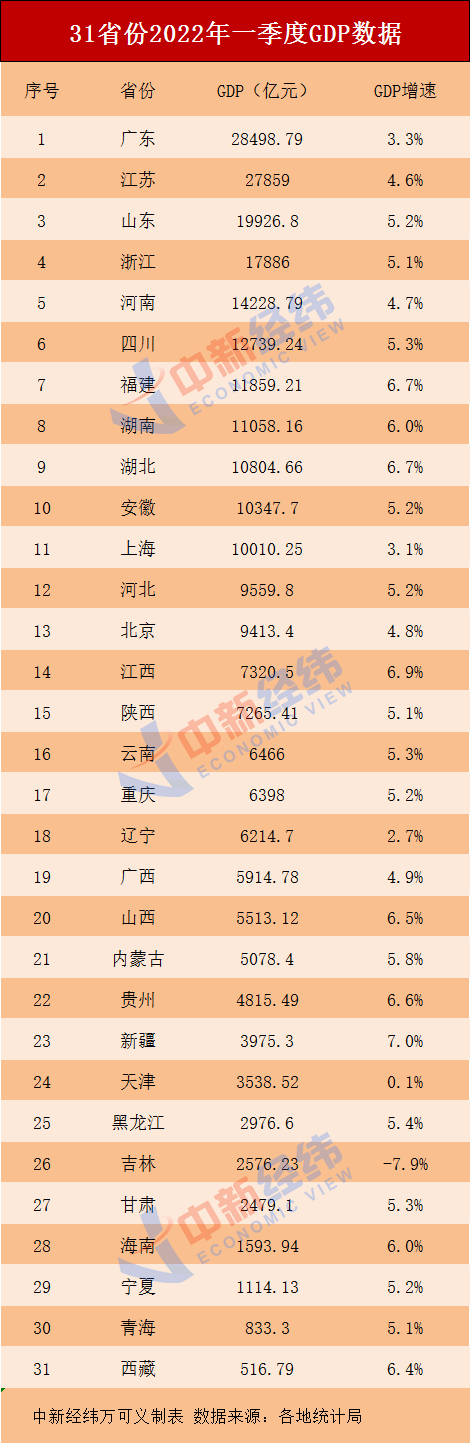 随着西藏于5月1日发布2022年一季度经济运行情况,31省份一季度GDP数据已全部出炉。总量方面,粤苏鲁稳居前三;增速方面,23省份高于“全国线”,新疆表现最佳,增速达到7.0%。
