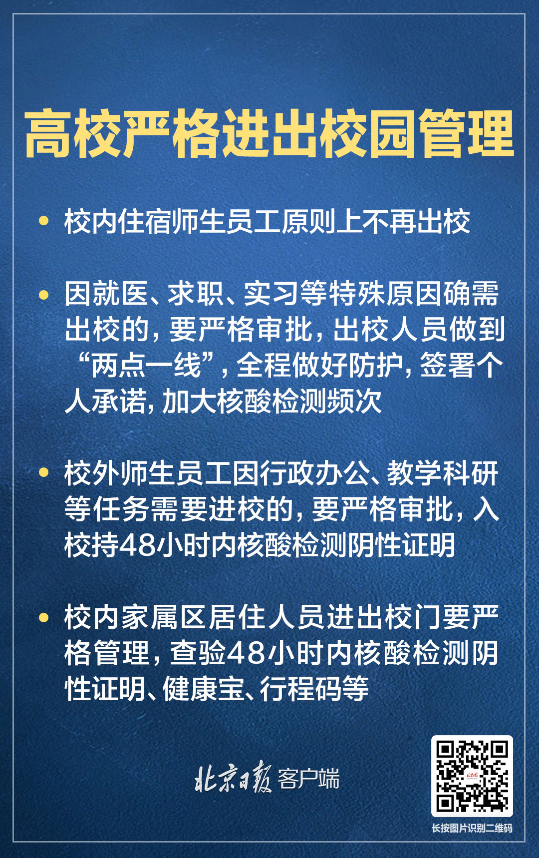 5月3日,在北京市新型冠状病毒肺炎疫情防控工作第323场新闻发布会上,北京市委教育工委副书记、市教委新闻发言人李奕介绍,本市严格师生员工进出管理。校内住宿师生员工原则上不再出校,对于因就医、求职、实习等特殊原因确需出校的,要严格审批,出校人员做到“两点一线”,全程做好防护,签署个人承诺,加大核酸检测频次。压缩教职工到校率,倡导线上办公。校外师生员工因行政办公、教学科研等任务需要进校的,要严格审批,入校持48小时内核酸检测阴性证明。