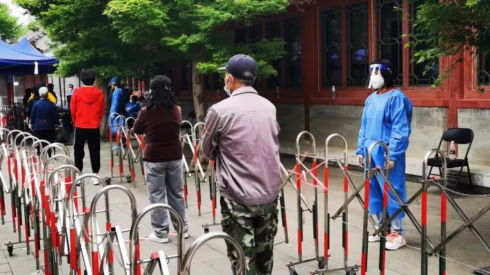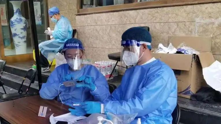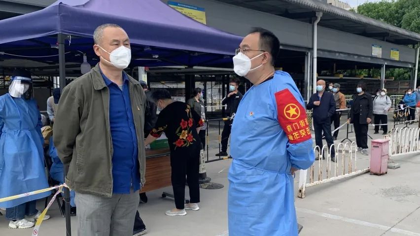 5月1日,区委巡察机构于磊、李宏宇、郑欢欢、段巨祥、梁首哲、汤浩等6名同志支援北新桥街道门楼社区核酸检测工作。