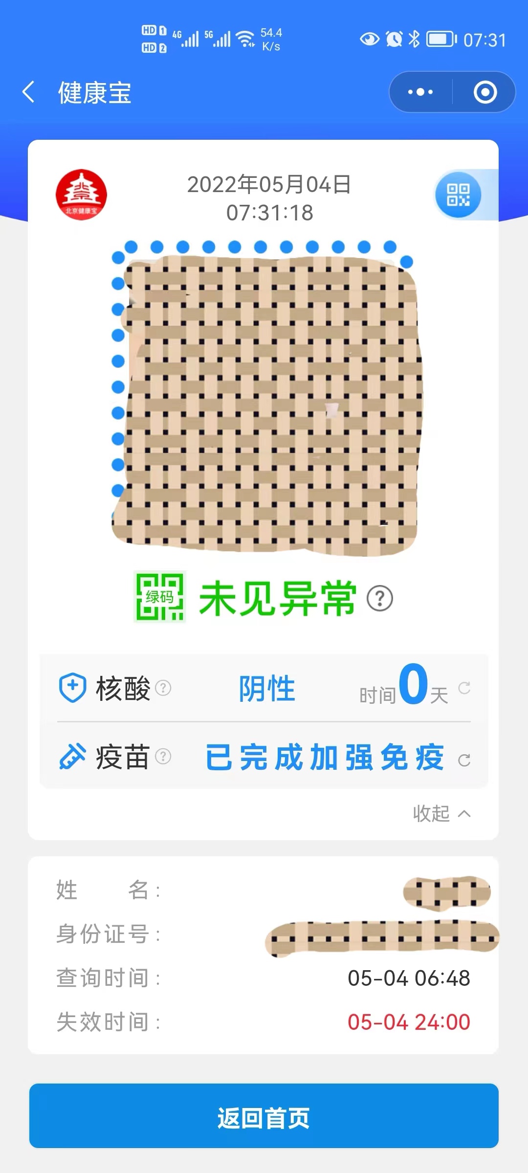 今天早晨,记者发现北京健康宝“上新”了!现在点击“本人健康码自查询”,不但可出示健康码,还可同时显示核酸检测和疫苗接种信息,大大提高了查验效率。