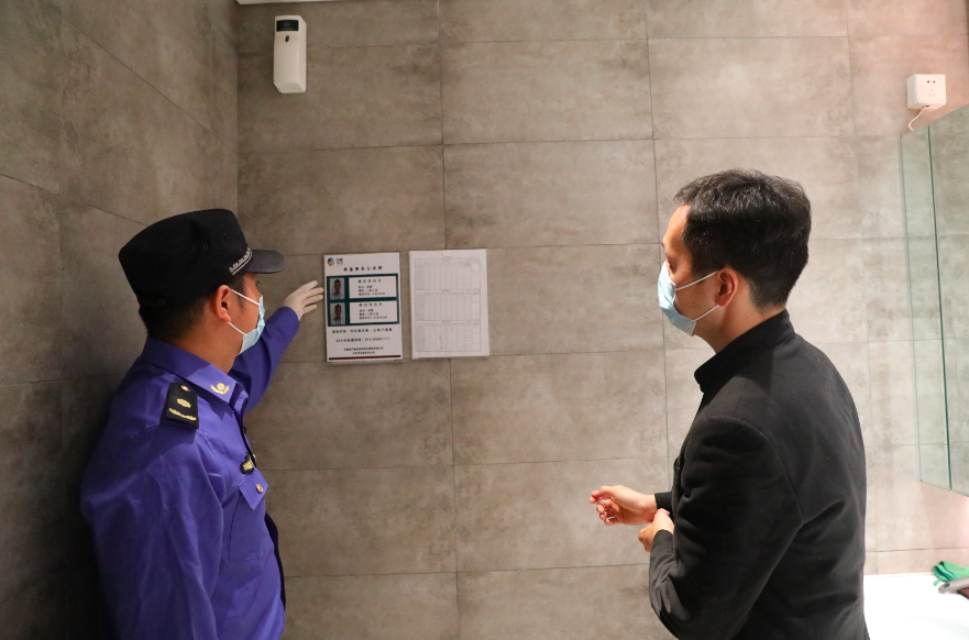 执法队员还对大厦内的公厕、电梯及地下车库的疫情防控措施进行了检查。据了解,大厦要求公厕一小时一消毒,并对电梯轿厢、扶手、按钮等经常接触的地方进行高频次消毒。在地下车库入口,执法人员要求,要对车上所有人员进行扫码测温,严把防疫关口。