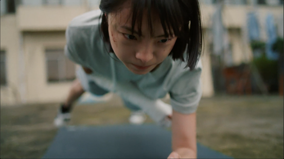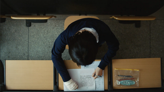 而到下一幕,影片开启倒叙。年轻女孩的好动、能吃、充满正义感。观众心中的兴趣也逐渐堆积:为什么女孩的信念如此笃定?她废寝忘食地学习、训练,乃至意外受伤后也要咬紧牙关用单手完成体能训练,以颤抖到抽筋的左手完成答题。