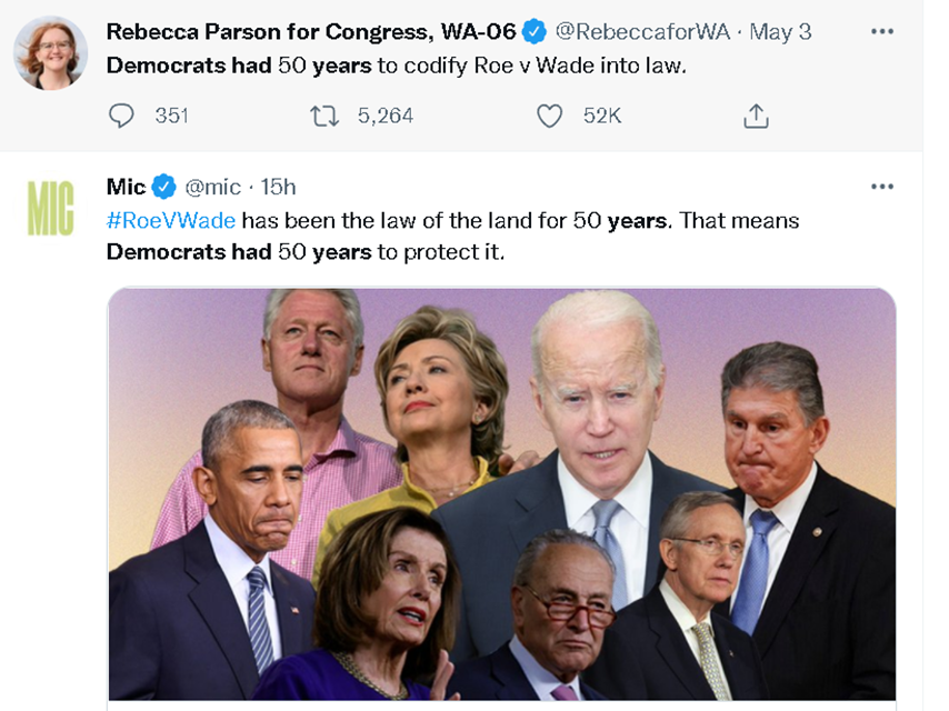 在那之后的近半个多世纪时间里,美国社会乃至政坛更是因为这个裁定而分裂成了极端对立的两个派别,即我们如今时常会在美国的新闻中听说的“Pro-Life”(“维护生命”派)和“Pro-Choice”(“维护选择权”派)。其中,“维护生命”派主要以美国的保守派政治势力为主,“维护选择”派则以美国的自由派政治势力为主。在党派层面,共和党更支持“维护生命”派,民主党更支持“维护选择”派。