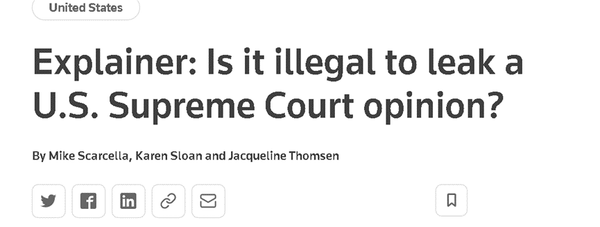 (根据英国路透社的介绍,此事泄露最高法院内部意见草案的做法是美国历史上绝无仅有的,虽然不是违法行为,但属于严重违规行为)