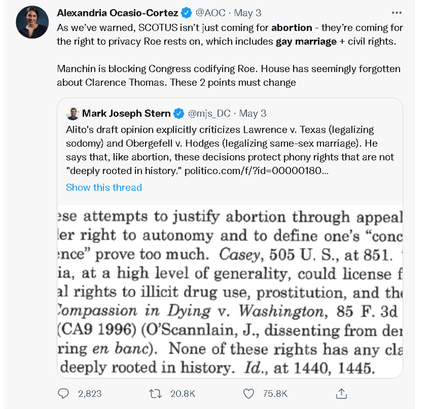 最后值得一提的是,除了上述这些体制层面的问题,此事还涉及到一个更为技术性的争议,那就是作为美国最高司法机关的最高法院,是否在诸如女性堕胎权或同性恋婚姻等问题上“僭越”了自己的权力范围,通过“扩大”宪法的适用范围,将自己变成了一个“立法机关”。