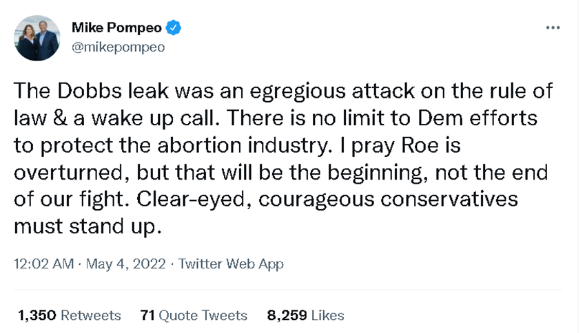 那些支持最高法院5名大法官的美国保守派人士就认为,是泄露内部文件的人在动摇美国“法治社会”的基石,这些人包括美国前国务卿蓬佩奥,以及共和党在美国国会参议院的领袖人物麦康奈尔。他们都在针对此事的发言中明确提到了泄露最高法院内部文件的事是对美国“法治社会”的攻击。