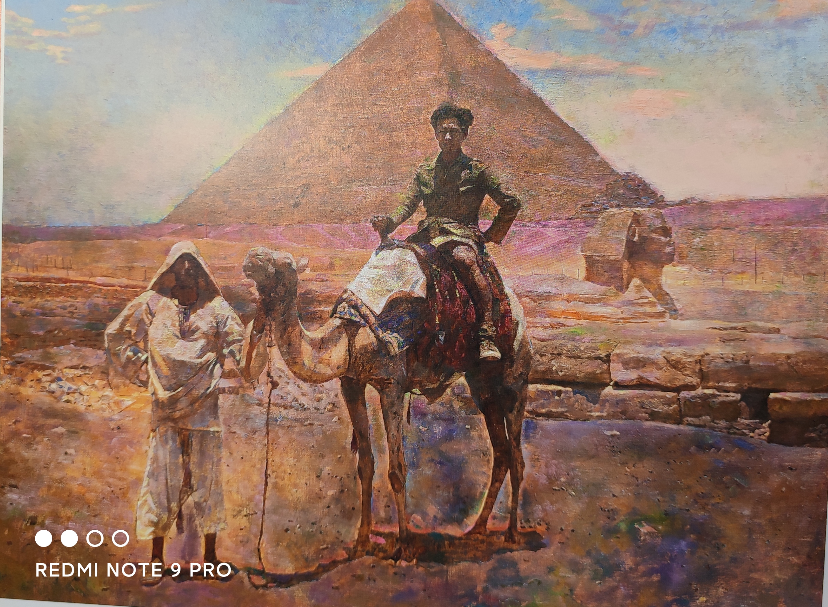 父亲在叙利亚首都大马士革的街头,碰到一个英国“兰铃”自行车公司的推销人,推销员为了给公司做宣传,硬是用一辆新车换走了他那辆旧车。可惜在耶路撒冷附近的一个小镇上,刚换来的新车却被人偷走了。他只好安步当车,迈向非洲大陆,并爬上了埃及金字塔。