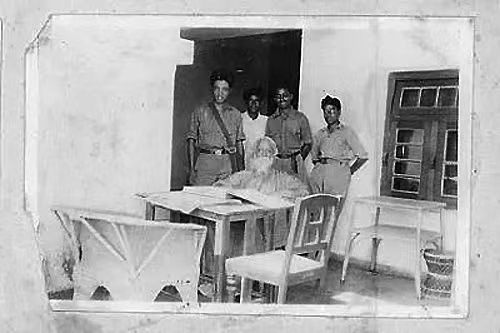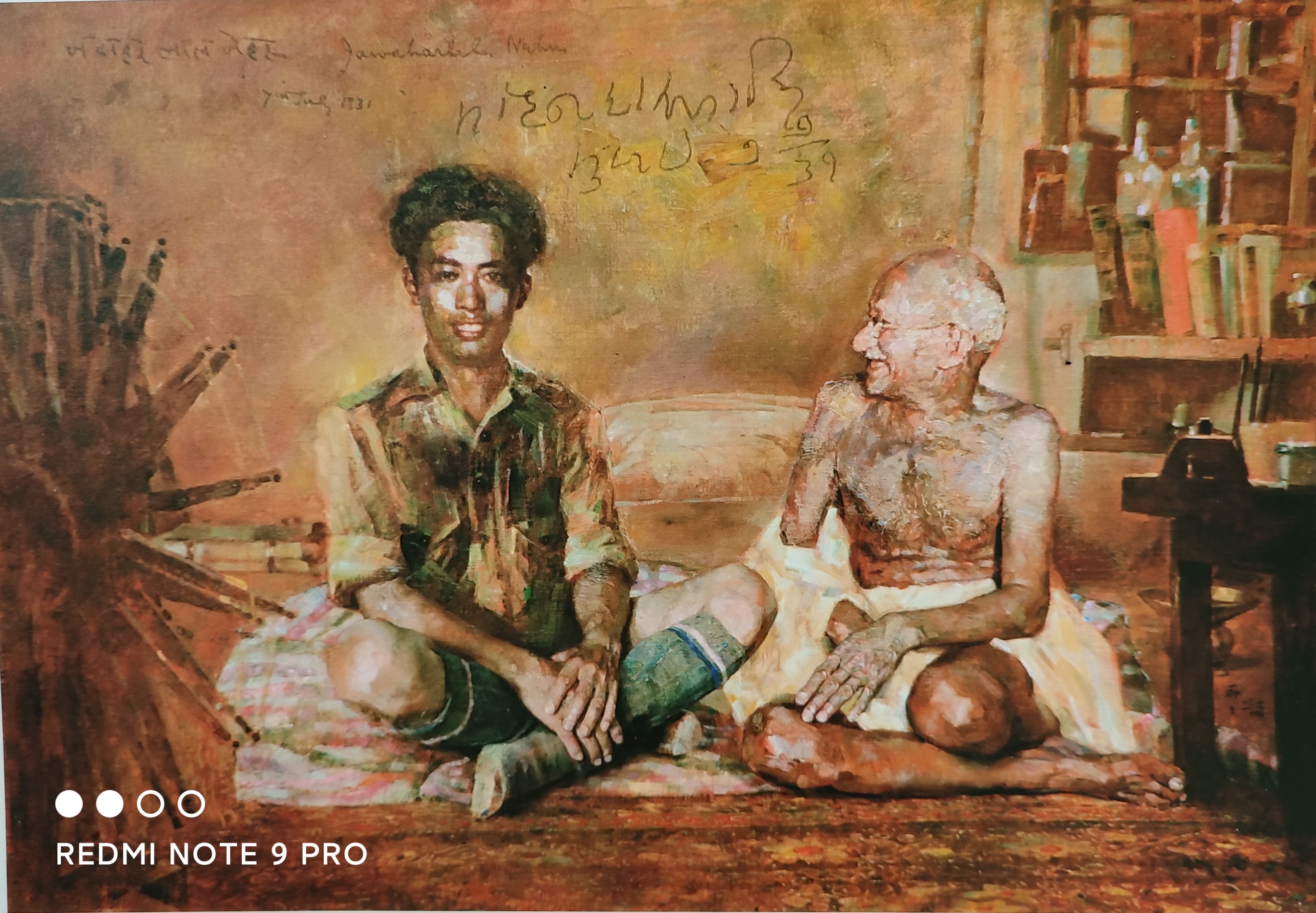 在印度,父亲在四位印度童子军陪同下,拜见了大文豪泰戈尔。泰戈尔在《名人留墨集》上签上了自己的名字,并赠送了一幅自己的画稿。最后还用中国话说:“祝你旅途安顺!”父亲还被印度国大党领袖“圣雄”甘地、尼赫鲁接见。我参考当年留下的合影,画了父亲和甘地在简陋的书房里席地而坐。甘地将一块亲手织的土布赠送给父亲。