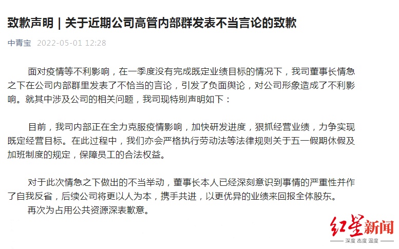 红星资本局5月1日消息,在“五一”国际劳动节这天,中青宝(300052.SZ)董事长因“‘五一’强制加班且无加班费”等不当言论致歉。