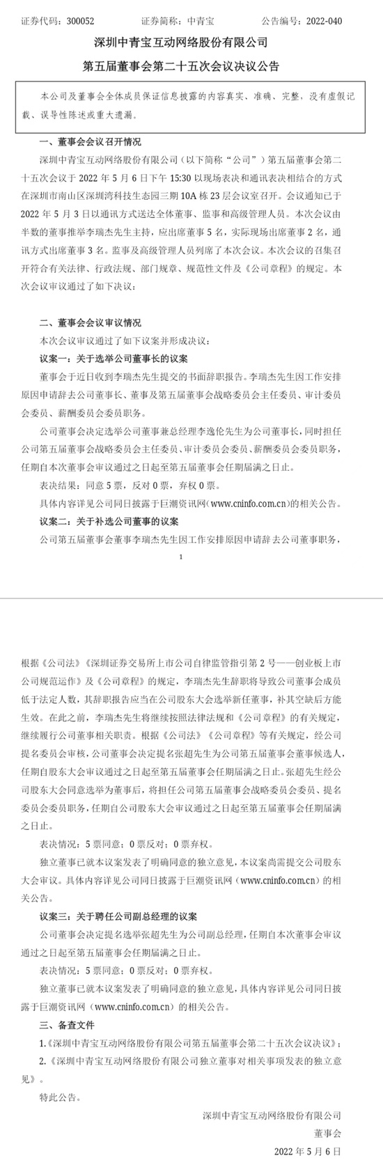 中青宝6日发布公告披露,公司董事会近日收到李瑞杰提交的书面辞职报告,其因工作安排原因申请辞去公司董事长等职务。公司董事会决定选举公司董事兼总经理李逸伦为公司董事长。