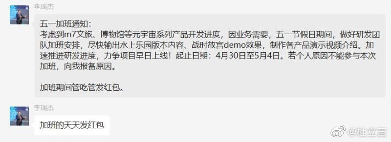日前,有网友曝光了数张聊天记录截图,截图显示,中青宝正在开发m7文旅、博物馆等元宇宙系列产品,为了保证进度,要求研发团队从4月30日至5月4日加班,若个人原因不能参与加班要报备。中青宝董事长李瑞杰直言:“所有的吹水佬,自己买块豆腐撞死吧。”“五一全部加班,不服的,马上炒掉。”“自己加班,没有加班费。”