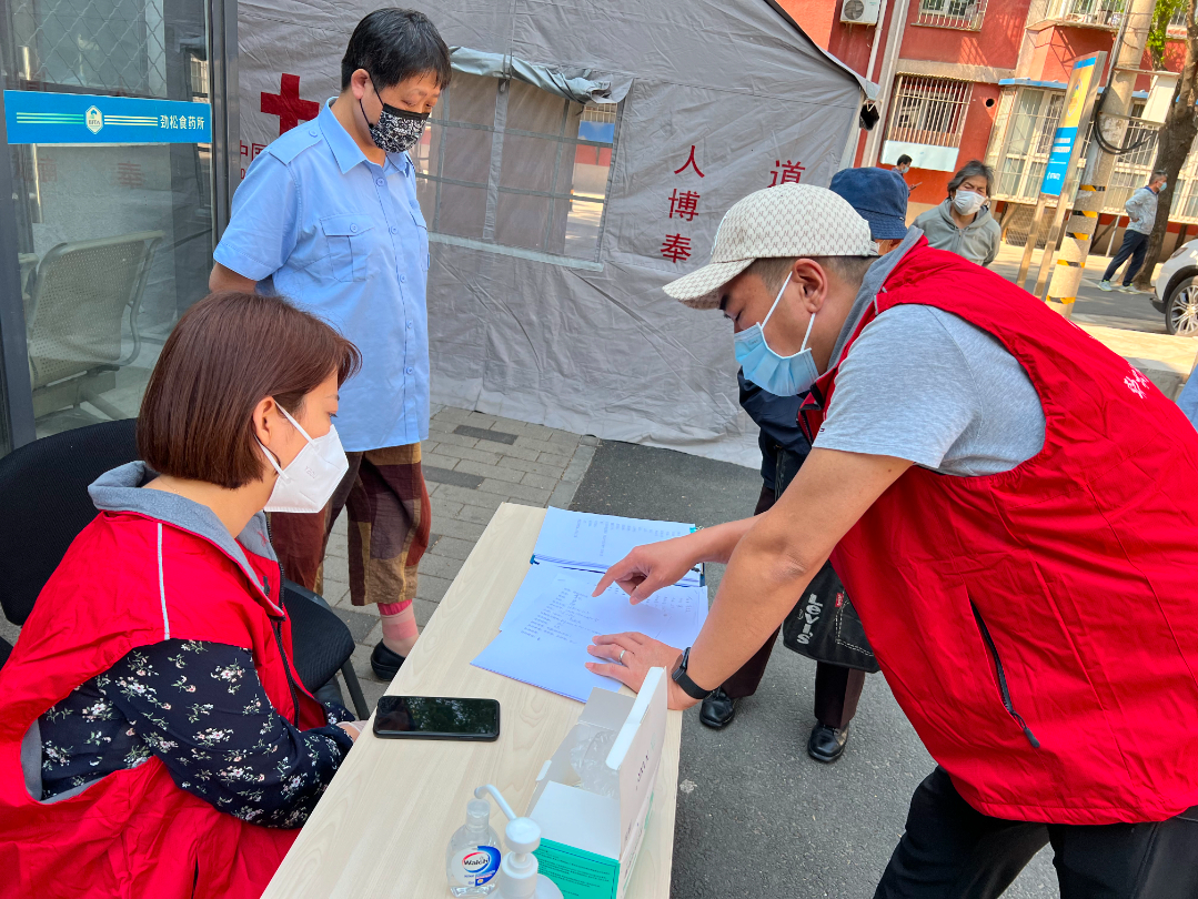 面对突发的疫情,在劲松北社区有这样一支居民志愿者队伍,他们在社区干部的带领下,每天都会耐心地帮助小区居民进行外出就诊登记、维持核酸检测秩序、协助进行日常的防疫措施,同时也帮助社区居民搬运防疫防控物资、为不会团购的老人提供一站式服务。