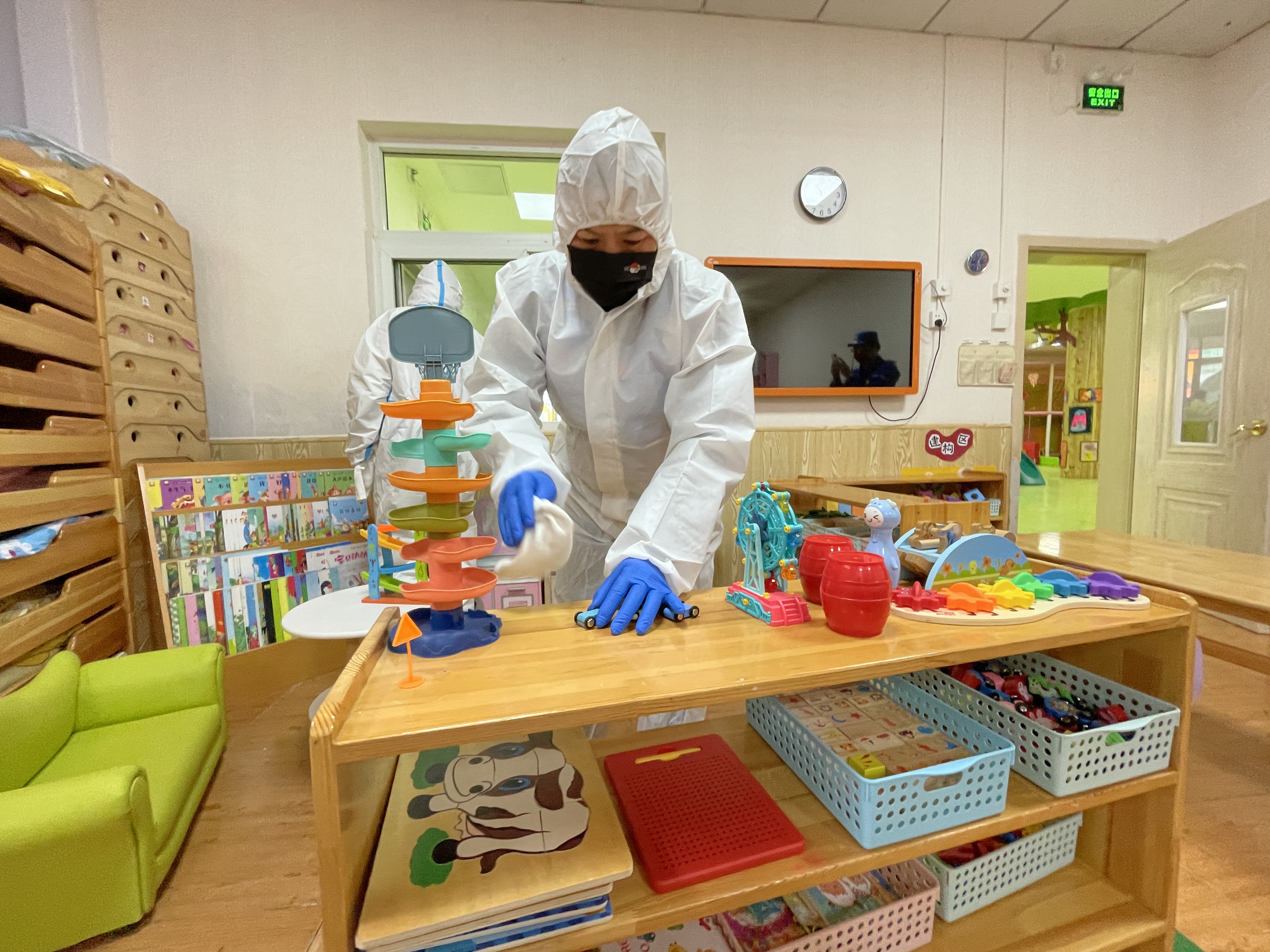 当日,在通州区马驹桥镇亲亲宝贝幼儿园小一班的教室里,一名“大白”正手持紫外线消毒喷雾枪,按照顺时针方向仔细地对家具物品喷洒酒精。身后队员则弓着身子,将低矮的小桌子、小椅子逐一擦净。“躲在”小书架里的各种玩具也没有被“大白”们忽视,小汽车、小动物们摆在了桌上,在酒精雾气中“沐浴”后擦干放回。