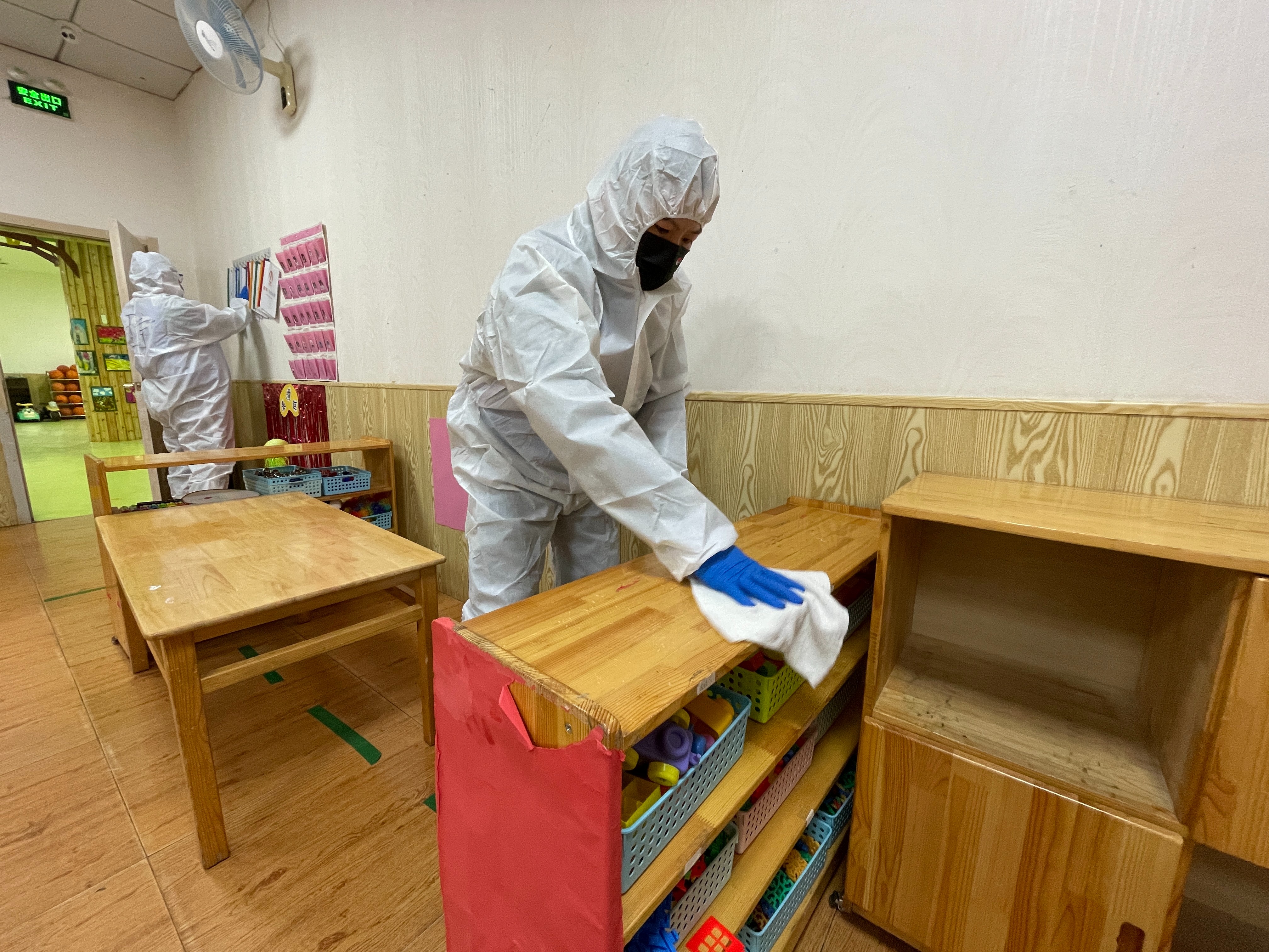 “平时社区的消杀主要用迷雾枪,操作起来很快,但是幼儿园是孩子们学习生活的场所,我们挑选了重点房间,改为安全、无残留的高浓度酒精手工擦拭消杀,让孩子们可以安心上学复课。”北京蓝天救援队(通州消杀防疫行动组)负责人徐斌告诉记者。